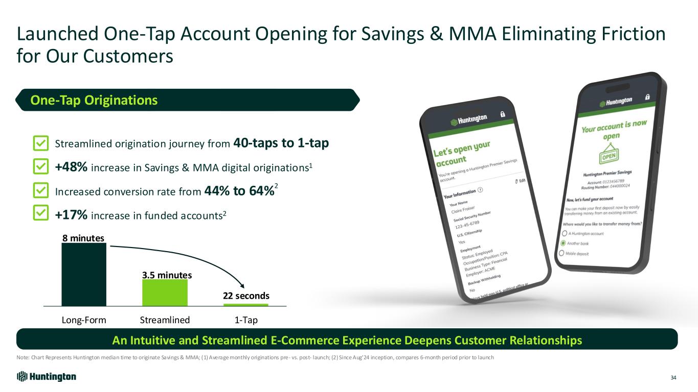 Delivering on Customer Expectations and Expanding Frictionless Access to Products and Colleagues 33 (1) Digital logins includes both mobile and web for full year period; Originations is inclusive of consumer product lines in checking, savings, card, mortgage, and lending. 136K 152K 2022 2024 Increased Digitally Acquired Consumer Households Increased Digital Originations Increased Digital Logins1 526K429K 2022 2024 Streamlined Originations Journeys for Savings & MMA 1 Expanded Product Offerings in Digital Marketplace Personalized MyOffers and Huntington.com 2 3 951M784M 2022 2024 Mobile First Customer Acquisition “Download the app”… migrating customer acquisition from huntington.com to an app lead call to action Expanding One-Tap Originations Simple and easy product originations across more product categories Real-Time Trigger-Based Offers Customer signal driven marketing and personalized offers delivered in real-time Enhanced Authentication Widening digital acquisition funnel by eliminating friction points and decreasing false positive fraud detection outcomes Innovation RoadmapExecution Highlights Since 2022 Delivered… Resulting in…