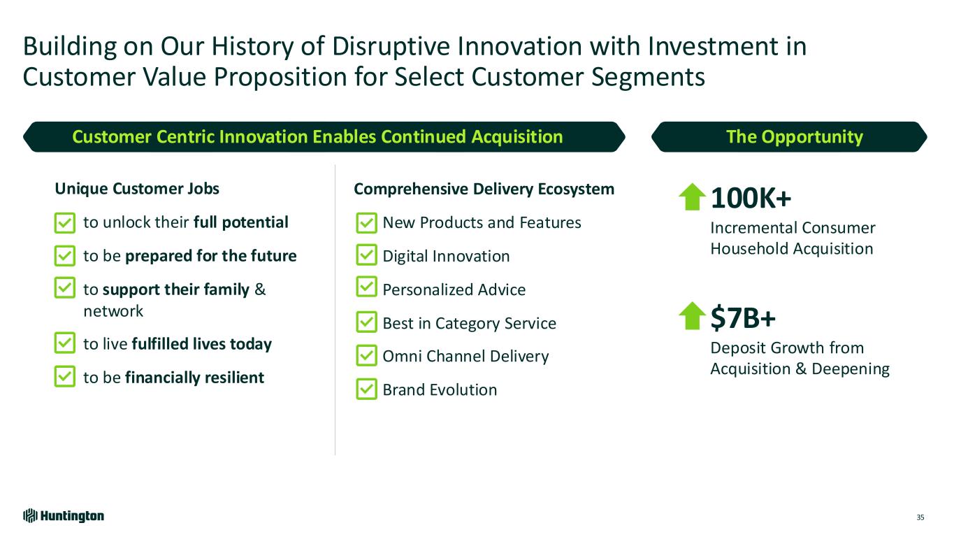 Note: Chart Represents Huntington median time to originate Savings & MMA; (1) Average monthly originations pre- vs. post- launch; (2) Since Aug’24 inception, compares 6-month period prior to launch An Intuitive and Streamlined E-Commerce Experience Deepens Customer Relationships 8 minutes 3.5 minutes 22 seconds Long-Form Streamlined 1-Tap Streamlined origination journey from 40-taps to 1-tap +48% increase in Savings & MMA digital originations1 Increased conversion rate from 44% to 64%2 +17% increase in funded accounts2 One-Tap Originations 34 Launched One-Tap Account Opening for Savings & MMA Eliminating Friction for Our Customers