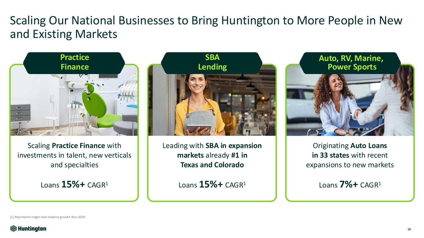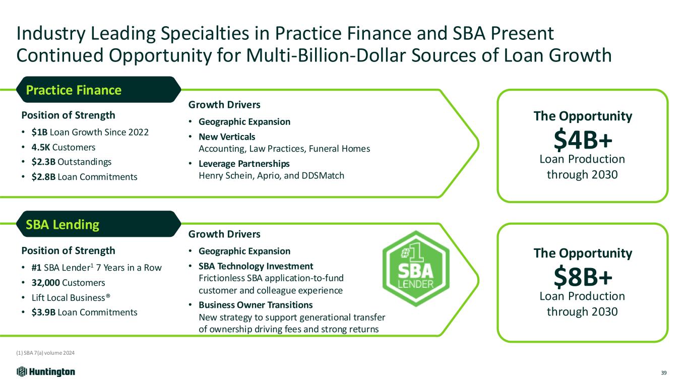 Scaling Our National Businesses to Bring Huntington to More People in New and Existing Markets 38 SBA Lending Auto, RV, Marine, Power Sports Practice Finance Scaling Practice Finance with investments in talent, new verticals and specialties Leading with SBA in expansion markets already #1 in Texas and Colorado Originating Auto Loans in 33 states with recent expansions to new markets Loans 15%+ CAGR1 Loans 15%+ CAGR1 Loans 7%+ CAGR1 (1) Represents target loan balance growth thru 2030