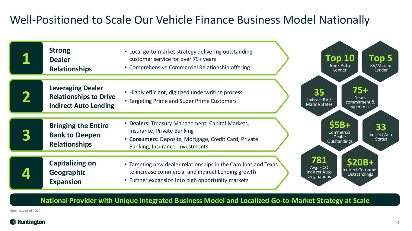 Industry Leading Specialties in Practice Finance and SBA Present Continued Opportunity for Multi-Billion-Dollar Sources of Loan Growth 39 (1) SBA 7(a) volume 2024 Practice Finance SBA Lending Position of Strength • $1B Loan Growth Since 2022 • 4.5K Customers • $2.3B Outstandings • $2.8B Loan Commitments Growth Drivers • Geographic Expansion • New Verticals Accounting, Law Practices, Funeral Homes • Leverage Partnerships Henry Schein, Aprio, and DDSMatch Position of Strength • #1 SBA Lender1 7 Years in a Row • 32,000 Customers • Lift Local Business® • $3.9B Loan Commitments Growth Drivers • Geographic Expansion • SBA Technology Investment Frictionless SBA application-to-fund customer and colleague experience • Business Owner Transitions New strategy to support generational transfer of ownership driving fees and strong returns The Opportunity $4B+ Loan Production through 2030 The Opportunity $8B+ Loan Production through 2030