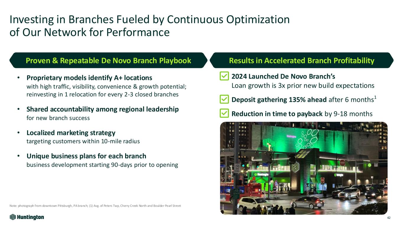 Leveraging Our Regional Banking Model to Drive Scale, Growth, and Expansion in Existing and New Markets 41 Regional Banking & Wealth Management Bringing the full Huntington Franchise to North Carolina and South Carolina >100 De Novo Branches by 2030 100+ +55 North & South Carolina +21 Colorado +25 Other States Growth Contribution Over 10 Years $10B+ Deposits $5B+ Loans $5B+ AUM • Branch Expansion • Mortgage • Regional Banking • Small Business • Wealth Management • Huntington Financial Advisors • Consumer Finance • Payments De Novo Branch Expansion Increasing Presence in Chicago Carolinas Buildout Built 4 Regional Banking Hubs Collectively going to market with the entire franchise capabilities to serve customers locally Regional Banking talent acquisition Added 14 new relationship managers with established in-market networks expected to produce $1.7B in loan production over five years Wealth Management talent acquisition Added a team of Private Bank wealth advisors and branch financial advisors to deliver our collaborative local go-to-market approach De Novo Branch Expansions