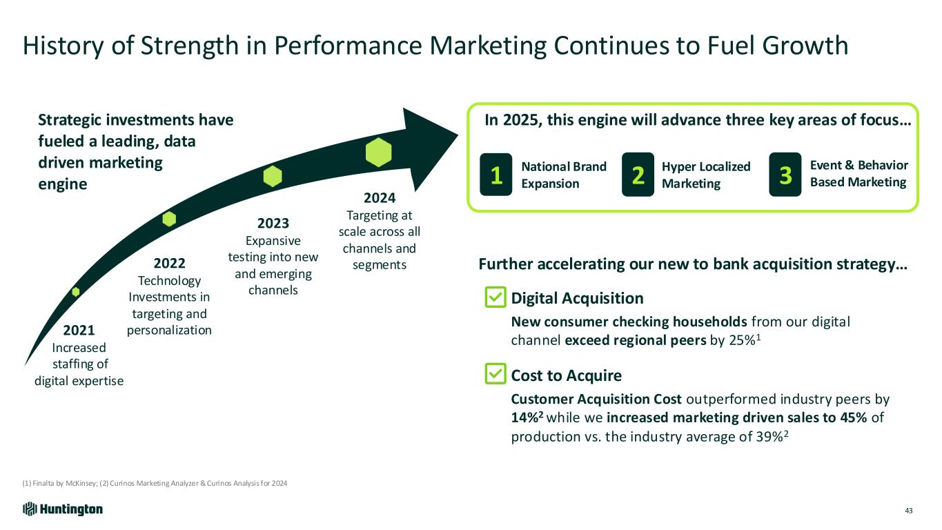 Investing in Branches Fueled by Continuous Optimization of Our Network for Performance 42 Note: photograph from downtown Pittsburgh, PA branch; (1) Avg. of Peters Twp, Cherry Creek North and Boulder Pearl Street Proven & Repeatable De Novo Branch Playbook • Proprietary models identify A+ locations with high traffic, visibility, convenience & growth potential; reinvesting in 1 relocation for every 2-3 closed branches • Shared accountability among regional leadership for new branch success • Localized marketing strategy targeting customers within 10-mile radius • Unique business plans for each branch business development starting 90-days prior to opening 2024 Launched De Novo Branch’s Loan growth is 3x prior new build expectations Deposit gathering 135% ahead after 6 months1 Reduction in time to payback by 9-18 months Results in Accelerated Branch Profitability