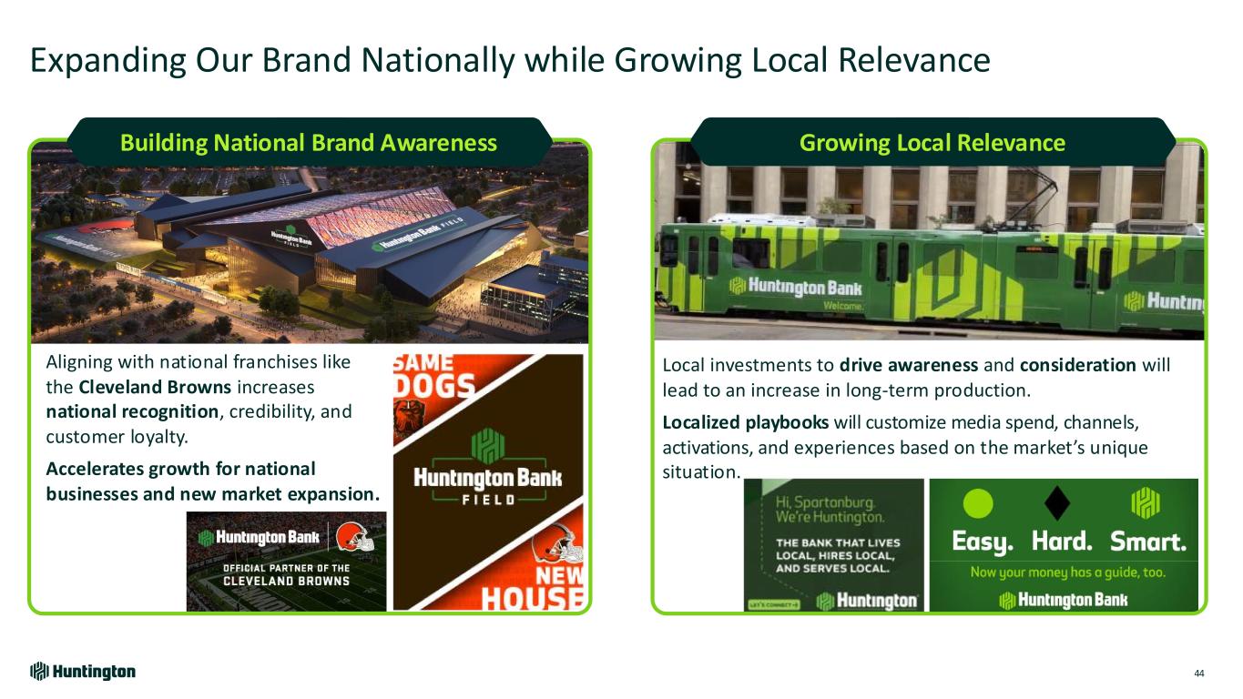 History of Strength in Performance Marketing Continues to Fuel Growth 43 (1) Finalta by McKinsey; (2) Curinos Marketing Analyzer & Curinos Analysis for 2024 Further accelerating our new to bank acquisition strategy… Strategic investments have fueled a leading, data driven marketing engine Cost to Acquire Customer Acquisition Cost outperformed industry peers by 14%2 while we increased marketing driven sales to 45% of production vs. the industry average of 39%2 Digital Acquisition New consumer checking households from our digital channel exceed regional peers by 25%1 2021 Increased staffing of digital expertise 2022 Technology Investments in targeting and personalization 2023 Expansive testing into new and emerging channels 2024 Targeting at scale across all channels and segments In 2025, this engine will advance three key areas of focus… National Brand Expansion Hyper Localized Marketing Event & Behavior Based Marketing1 2 3