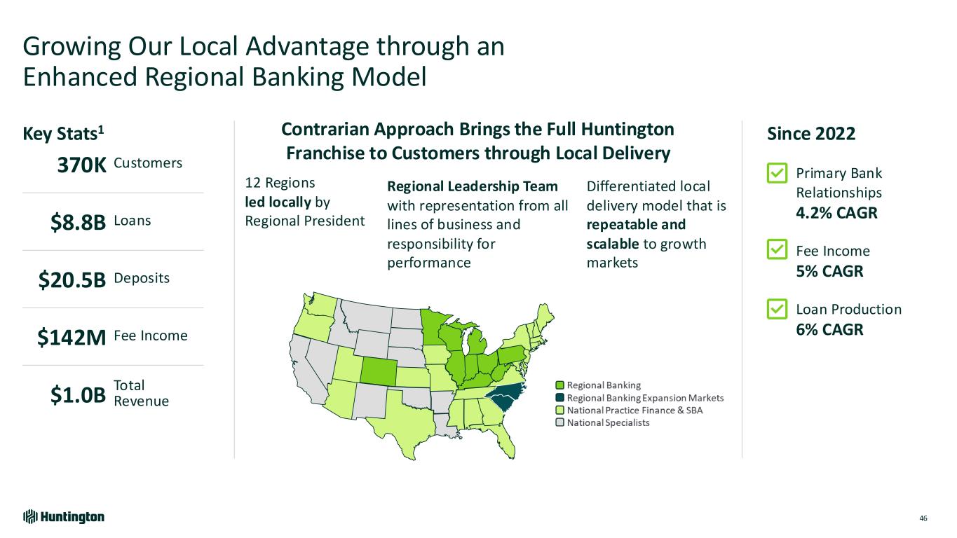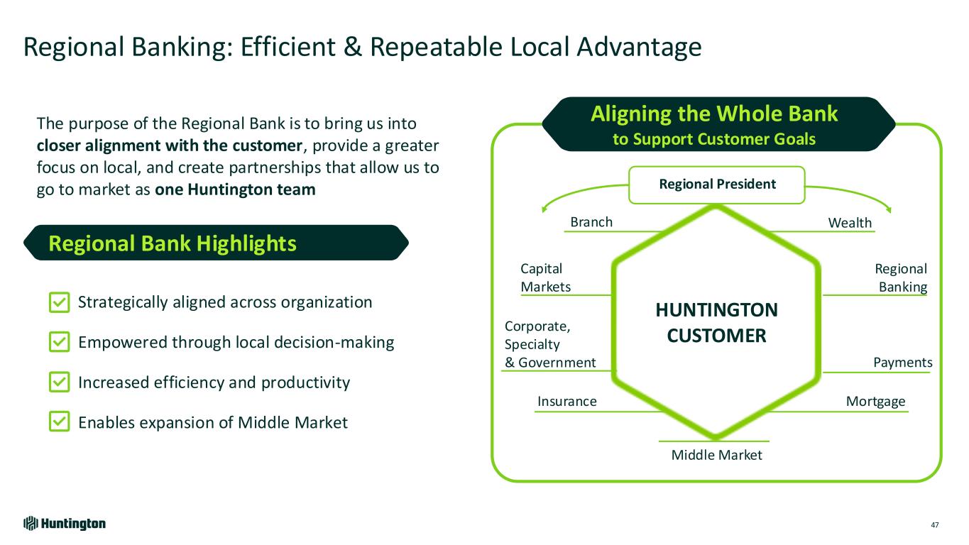 Growing Our Local Advantage through an Enhanced Regional Banking Model 46 370K Customers $8.8B Loans $20.5B Deposits $142M Fee Income $1.0B Total Revenue 12 Regions led locally by Regional President Contrarian Approach Brings the Full Huntington Franchise to Customers through Local Delivery Since 2022 Primary Bank Relationships 4.2% CAGR Fee Income 5% CAGR Loan Production 6% CAGR Key Stats1 Differentiated local delivery model that is repeatable and scalable to growth markets Regional Leadership Team with representation from all lines of business and responsibility for performance
