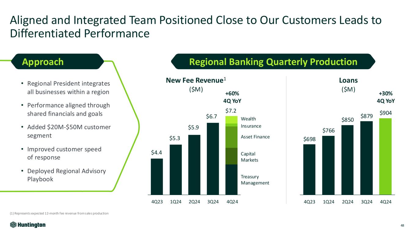 Regional Banking: Efficient & Repeatable Local Advantage 47 Strategically aligned across organization Empowered through local decision-making Increased efficiency and productivity Enables expansion of Middle Market The purpose of the Regional Bank is to bring us into closer alignment with the customer, provide a greater focus on local, and create partnerships that allow us to go to market as one Huntington team Branch Capital Markets Insurance Wealth Payments Mortgage Middle Market HUNTINGTON CUSTOMER Corporate, Specialty & Government Regional President Regional Banking Regional Bank Highlights Aligning the Whole Bank to Support Customer Goals