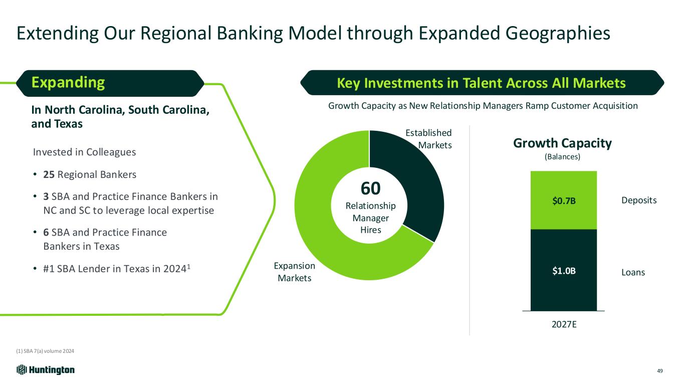 4Q23 1Q24 2Q24 3Q24 4Q24 Aligned and Integrated Team Positioned Close to Our Customers Leads to Differentiated Performance 48 (1) Represents expected 12-month fee revenue from sales production • Regional President integrates all businesses within a region • Performance aligned through shared financials and goals • Added $20M-$50M customer segment • Improved customer speed of response • Deployed Regional Advisory Playbook Treasury Management Capital Markets Asset Finance Insurance Wealth Loans ($M) New Fee Revenue1 ($M) Approach Regional Banking Quarterly Production $698 $766 $850 $879 $904 4Q23 1Q24 2Q24 3Q24 4Q24 +60% 4Q YoY +30% 4Q YoY $4.4 $5.3 $5.9 $6.7 $7.2