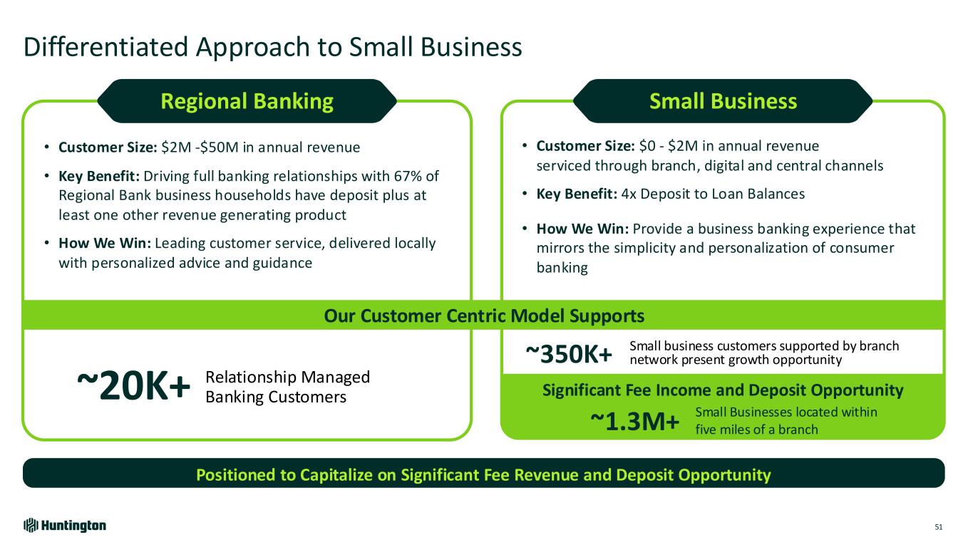 Mutual Winning Results $40M revolving Line of Credit $9M Deposits Annual Recurring Fees $300k Trust $300k Merchant Services $60k Commercial Card $9k Treasury Management Differentiated Solution Local colleagues enlisted national expertise for unique solution • Institutional Specialty Trust • Non-profit Banking • TM and Merchant Services • Capital Markets • Credit Client selected Huntington due to ability to service their entire financial needs • 180-year-old Detroit based service company • Interest in creating a Trust and a $60M building expansion • Approached local team due to dissatisfaction with other banks who could not create a holistic solution for their unique situation Case Study | Executing Enhanced Regional Banking Model 50 Opportunity
