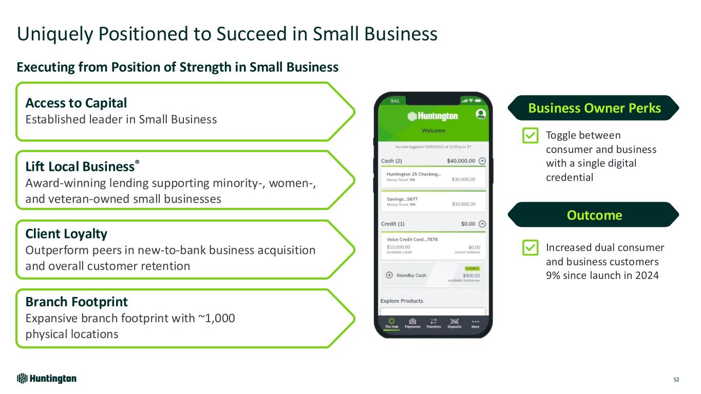 • Customer Size: $0 - $2M in annual revenue serviced through branch, digital and central channels • Key Benefit: 4x Deposit to Loan Balances • How We Win: Provide a business banking experience that mirrors the simplicity and personalization of consumer banking • Customer Size: $2M -$50M in annual revenue • Key Benefit: Driving full banking relationships with 67% of Regional Bank business households have deposit plus at least one other revenue generating product • How We Win: Leading customer service, delivered locally with personalized advice and guidance Differentiated Approach to Small Business 51 Positioned to Capitalize on Significant Fee Revenue and Deposit Opportunity Regional Banking Small Business ~20K+ Relationship Managed Banking Customers Small business customers supported by branch network present growth opportunity~350K+ ~1.3M+ Significant Fee Income and Deposit Opportunity Small Businesses located within five miles of a branch Our Customer Centric Model Supports