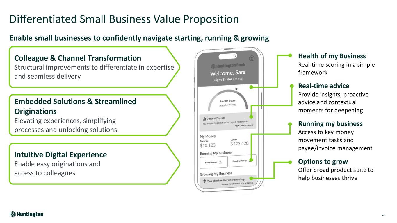 Uniquely Positioned to Succeed in Small Business 52 Client Loyalty Outperform peers in new-to-bank business acquisition and overall customer retention Access to Capital Established leader in Small Business Branch Footprint Expansive branch footprint with ~1,000 physical locations Lift Local Business® Award-winning lending supporting minority-, women-, and veteran-owned small businesses Executing from Position of Strength in Small Business Business Owner Perks Outcome Toggle between consumer and business with a single digital credential Increased dual consumer and business customers 9% since launch in 2024