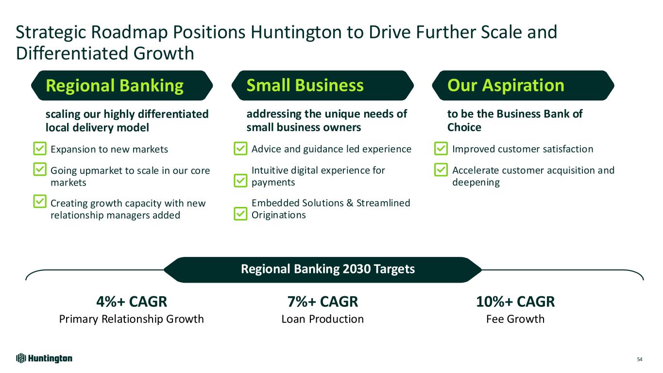 Strategic Roadmap Positions Huntington to Drive Further Scale and Differentiated Growth 54 Small Business addressing the unique needs of small business owners Advice and guidance led experience Intuitive digital experience for payments Embedded Solutions & Streamlined Originations Our Aspiration to be the Business Bank of Choice Improved customer satisfaction Accelerate customer acquisition and deepening Regional Banking scaling our highly differentiated local delivery model Expansion to new markets Going upmarket to scale in our core markets Creating growth capacity with new relationship managers added Regional Banking 2030 Targets 4%+ CAGR Primary Relationship Growth 7%+ CAGR Loan Production 10%+ CAGR Fee Growth