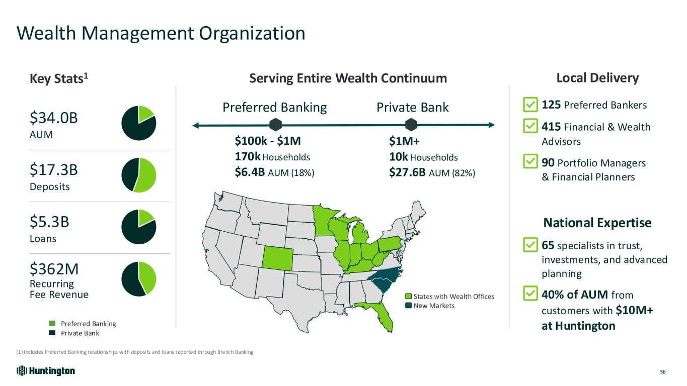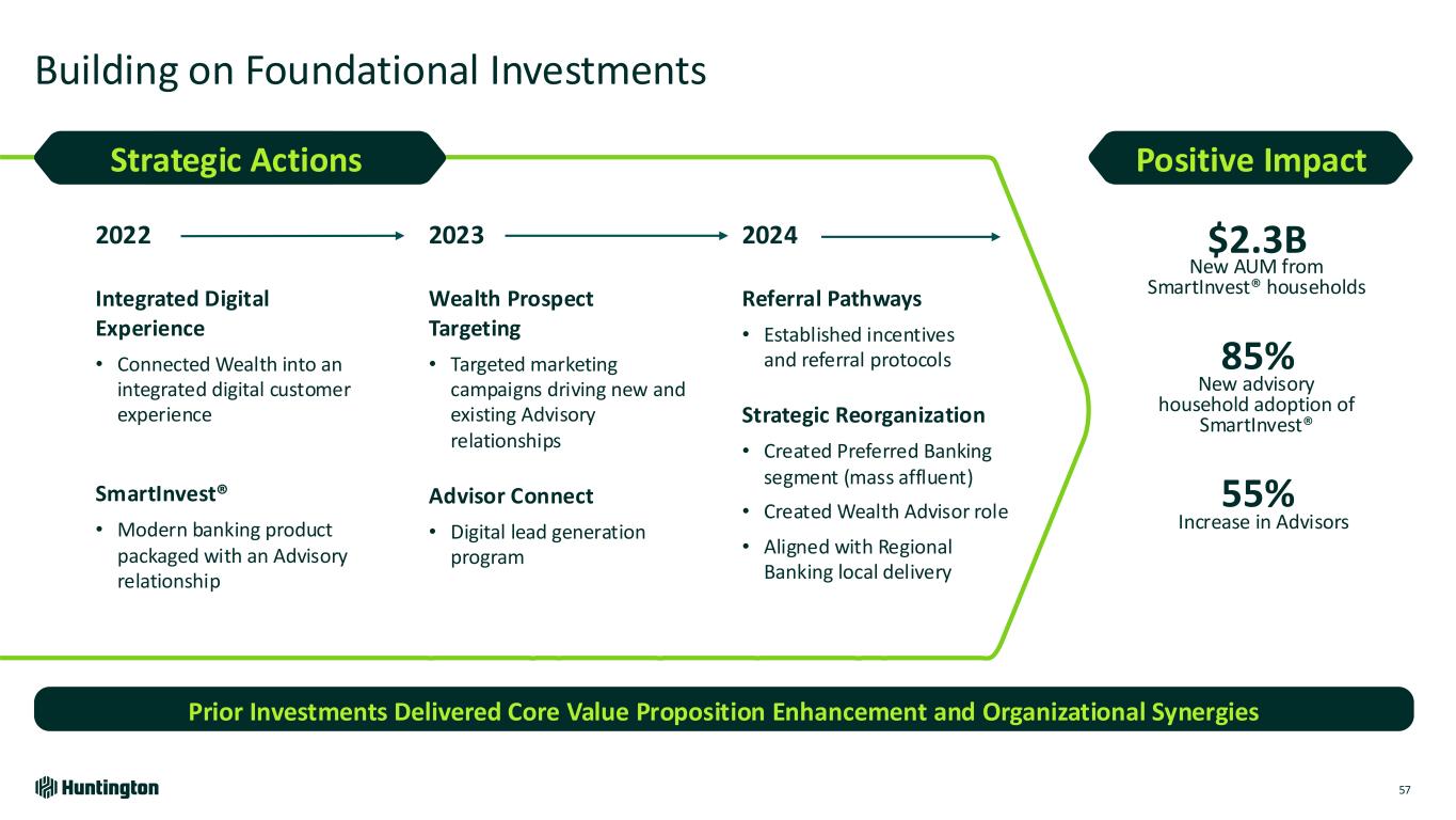 Preferred Banking Private Bank Wealth Management Organization 56 (1) Includes Preferred Banking relationships with deposits and loans reported through Branch Banking Key Stats1 Private Bank Preferred Banking $34.0B AUM $17.3B Deposits $5.3B Loans $362M Recurring Fee Revenue Serving Entire Wealth Continuum Local Delivery 125 Preferred Bankers 415 Financial & Wealth Advisors 90 Portfolio Managers & Financial Planners National Expertise 65 specialists in trust, investments, and advanced planning 40% of AUM from customers with $10M+ at Huntington $100k - $1M 170k Households $6.4B AUM (18%) $1M+ 10k Households $27.6B AUM (82%) States with Wealth Offices New Markets