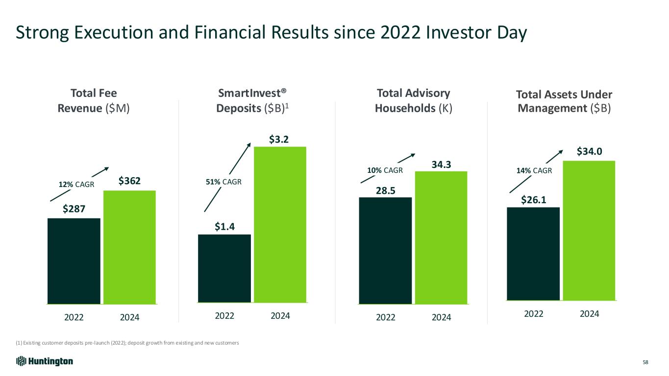 Building on Foundational Investments 57 Prior Investments Delivered Core Value Proposition Enhancement and Organizational Synergies 85% New advisory household adoption of SmartInvest® $2.3B New AUM from SmartInvest® households 2022 2023 2024 Integrated Digital Experience • Connected Wealth into an integrated digital customer experience SmartInvest® • Modern banking product packaged with an Advisory relationship Wealth Prospect Targeting • Targeted marketing campaigns driving new and existing Advisory relationships Advisor Connect • Digital lead generation program Referral Pathways • Established incentives and referral protocols Strategic Reorganization • Created Preferred Banking segment (mass affluent) • Created Wealth Advisor role • Aligned with Regional Banking local delivery 55% Increase in Advisors Strategic Actions Positive Impact