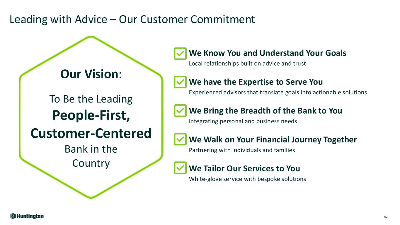 Differentiating in Key Customer Segments 61 Mass Affluent High & Ultra High Net Worth Local branch-based Financial Advisors & Preferred Bankers Local Relationships Local offices of Wealth Teams aligned with Regional Banking Goals-Based Planning at scale for major life events – education, retirement, inheritance Leading with Advice & Guidance Legacy Planning Expertise in trust, estate planning, and generational family wealth SmartInvest® banking and investments value proposition with relationship pricing Unique Products & Solutions Business Transitions Helping business owners transition to the next phase Preferred Banking Private Bank