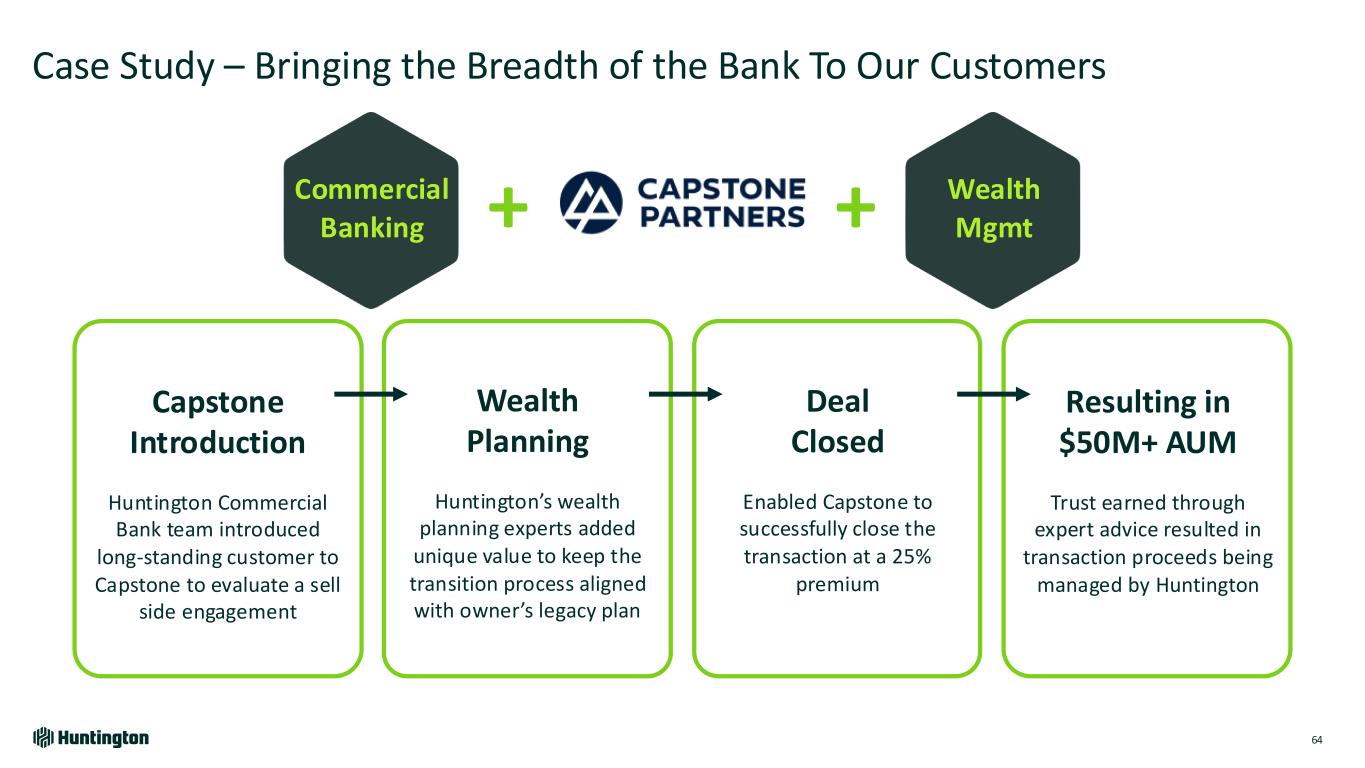 Case Study – Bringing the Breadth of the Bank To Our Customers 64 ++Commercial Banking Wealth Mgmt Capstone Introduction Huntington Commercial Bank team introduced long-standing customer to Capstone to evaluate a sell side engagement Wealth Planning Huntington’s wealth planning experts added unique value to keep the transition process aligned with owner’s legacy plan Deal Closed Enabled Capstone to successfully close the transaction at a 25% premium Resulting in $50M+ AUM Trust earned through expert advice resulted in transaction proceeds being managed by Huntington