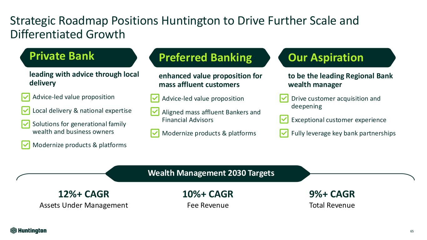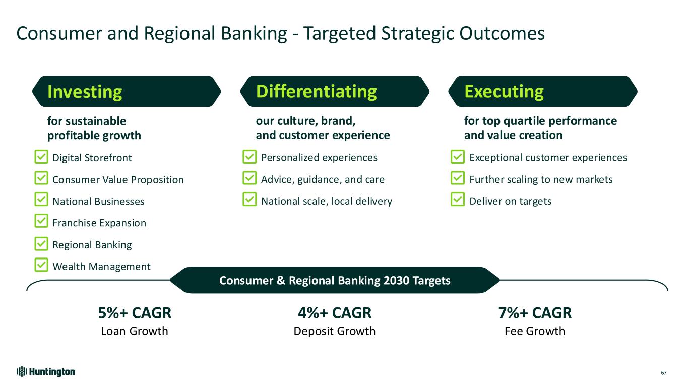 Strategic Roadmap Positions Huntington to Drive Further Scale and Differentiated Growth 65 Preferred Banking enhanced value proposition for mass affluent customers Advice-led value proposition Aligned mass affluent Bankers and Financial Advisors Modernize products & platforms Our Aspiration to be the leading Regional Bank wealth manager Drive customer acquisition and deepening Exceptional customer experience Fully leverage key bank partnerships Private Bank leading with advice through local delivery Advice-led value proposition Local delivery & national expertise Solutions for generational family wealth and business owners Modernize products & platforms Wealth Management 2030 Targets 12%+ CAGR Assets Under Management 10%+ CAGR Fee Revenue 9%+ CAGR Total Revenue