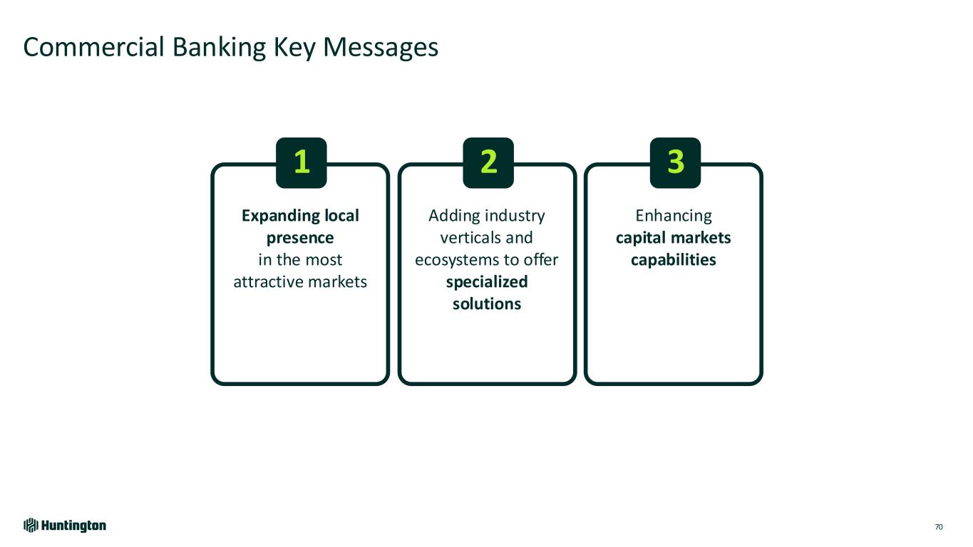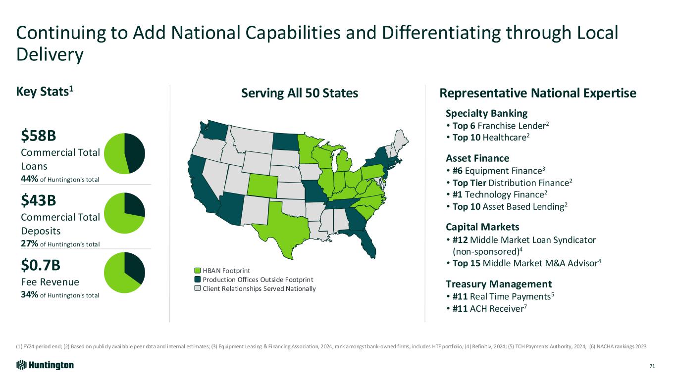 Continuing to Add National Capabilities and Differentiating through Local Delivery 71 (1) FY24 period end; (2) Based on publicly available peer data and internal estimates; (3) Equipment Leasing & Financing Association, 2024, rank amongst bank-owned firms, includes HTF portfolio; (4) Refinitiv, 2024; (5) TCH Payments Authority, 2024; (6) NACHA rankings 2023 Key Stats1 Specialty Banking • Top 6 Franchise Lender2 • Top 10 Healthcare2 Asset Finance • #6 Equipment Finance3 • Top Tier Distribution Finance2 • #1 Technology Finance2 • Top 10 Asset Based Lending2 Capital Markets • #12 Middle Market Loan Syndicator (non-sponsored)4 • Top 15 Middle Market M&A Advisor4 Treasury Management • #11 Real Time Payments5 • #11 ACH Receiver7 $58B Commercial Total Loans 44% of Huntington's total $43B Commercial Total Deposits 27% of Huntington’s total $0.7B Fee Revenue 34% of Huntington's total Representative National ExpertiseServing All 50 States HBAN Footprint Production Offices Outside Footprint Client Relationships Served Nationally