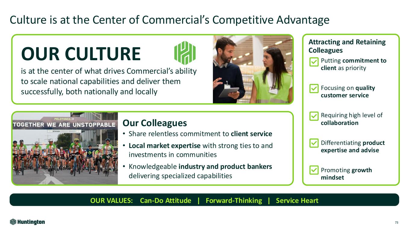 Attracting and Retaining Colleagues Putting commitment to client as priority Focusing on quality customer service Requiring high level of collaboration Differentiating product expertise and advise Promoting growth mindset 24 Culture is at the Center of Commercial’s Competitive Advantage 73 OUR VALUES: Can-Do Attitude | Forward-Thinking | Service Heart OUR CULTURE is at the center of what drives Commercial’s ability to scale national capabilities and deliver them successfully, both nationally and locally Our Colleagues • Share relentless commitment to client service • Local market expertise with strong ties to and investments in communities • Knowledgeable industry and product bankers delivering specialized capabilities