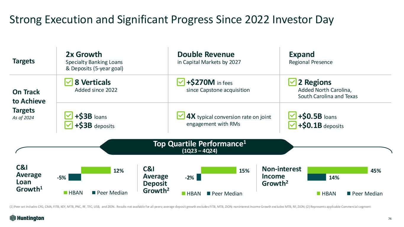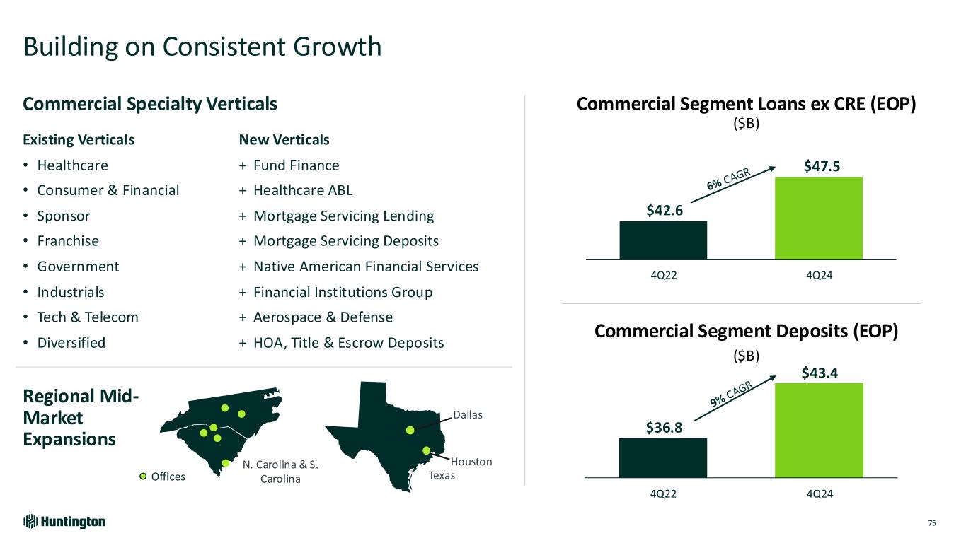 -2% 15% HBAN Peer Median Strong Execution and Significant Progress Since 2022 Investor Day 74 (1) Peer set includes CFG, CMA, FITB, KEY, MTB, PNC, RF, TFC, USB, and ZION. Results not available for all peers; average deposit growth excludes FITB, MTB, ZION; noninterest Income Growth excludes MTB, RF, ZION; (2) Represents applicable Commercial segment Targets 2x Growth Specialty Banking Loans & Deposits (5-year goal) Double Revenue in Capital Markets by 2027 Expand Regional Presence On Track to Achieve Targets As of 2024 8 Verticals Added since 2022 +$270M in fees since Capstone acquisition 2 Regions Added North Carolina, South Carolina and Texas +$3B loans +$3B deposits 4X typical conversion rate on joint engagement with RMs +$0.5B loans +$0.1B deposits C&I Average Loan Growth1 C&I Average Deposit Growth2 Non-interest Income Growth2 -5% 12% HBAN Peer Median 14% 45% HBAN Peer Median Top Quartile Performance1 (1Q23 – 4Q24)