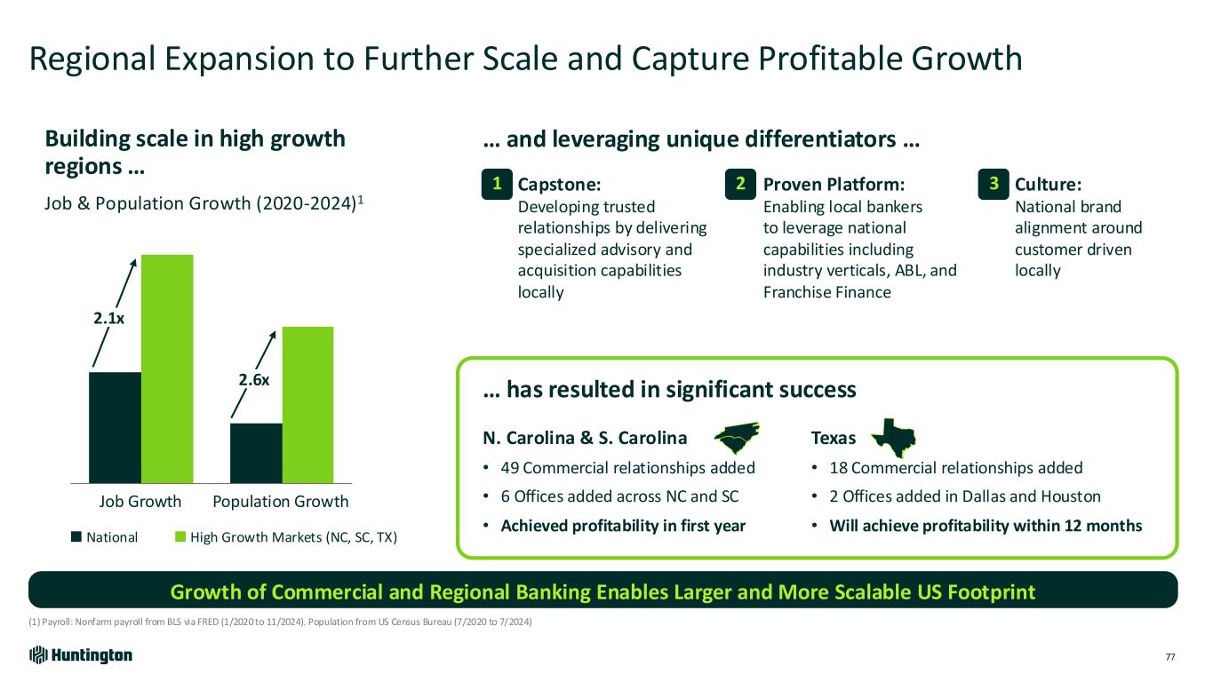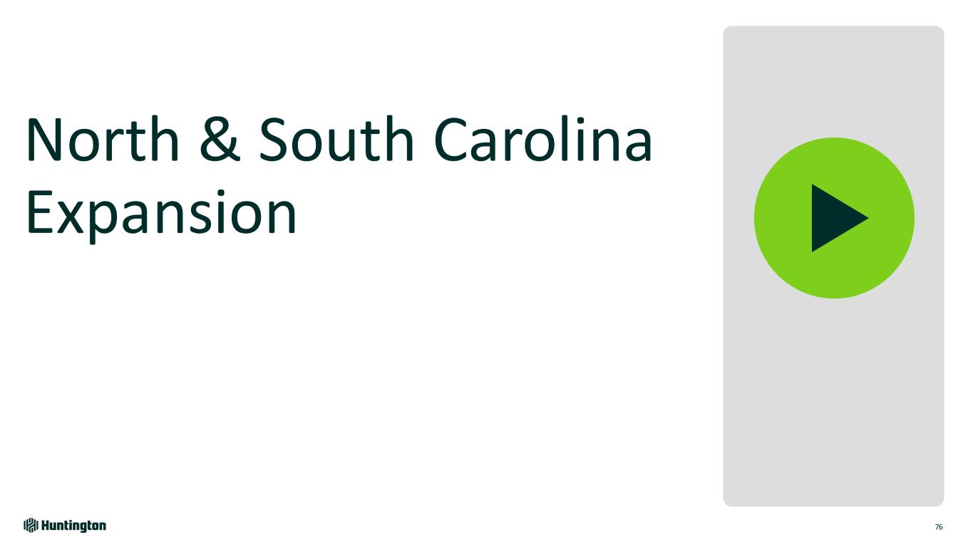 Building on Consistent Growth 75 New Verticals + Fund Finance + Healthcare ABL + Mortgage Servicing Lending + Mortgage Servicing Deposits + Native American Financial Services + Financial Institutions Group + Aerospace & Defense + HOA, Title & Escrow Deposits Commercial Specialty Verticals Commercial Segment Loans ex CRE (EOP) ($B) $42.6 $47.5 4Q22 4Q24 $36.8 $43.4 4Q22 4Q24 Texas N. Carolina & S. CarolinaOffices Existing Verticals • Healthcare • Consumer & Financial • Sponsor • Franchise • Government • Industrials • Tech & Telecom • Diversified Regional Mid- Market Expansions Commercial Segment Deposits (EOP) ($B) Dallas Houston