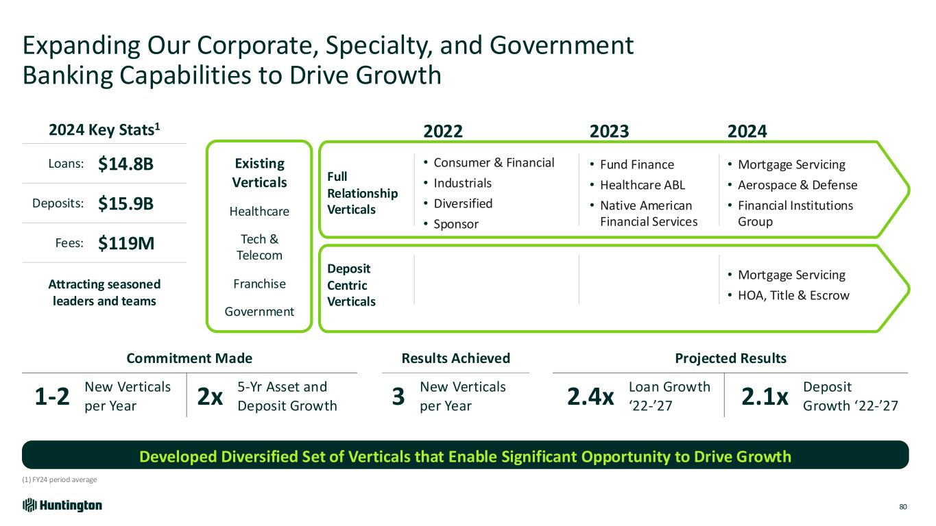 Expanding Our Corporate, Specialty, and Government Banking Capabilities to Drive Growth Developed Diversified Set of Verticals that Enable Significant Opportunity to Drive Growth 2022 2023 2024 Full Relationship Verticals • Consumer & Financial • Industrials • Diversified • Sponsor • Fund Finance • Healthcare ABL • Native American Financial Services • Mortgage Servicing • Aerospace & Defense • Financial Institutions Group Deposit Centric Verticals • Mortgage Servicing • HOA, Title & Escrow Existing Verticals Healthcare Tech & Telecom Franchise Government 2024 Key Stats1 Loans: $14.8B Deposits: $15.9B Fees: $119M Attracting seasoned leaders and teams Commitment Made Results Achieved Projected Results 1-2 New Verticals per Year 2x 5-Yr Asset and Deposit Growth 3 New Verticals per Year 2.4x Loan Growth ‘22-’27 2.1x Deposit Growth ‘22-’27 80 (1) FY24 period average