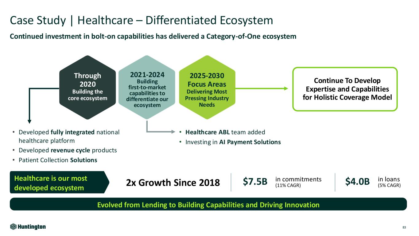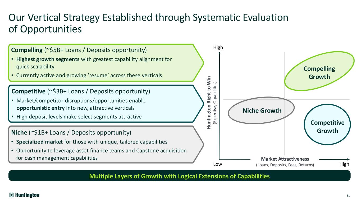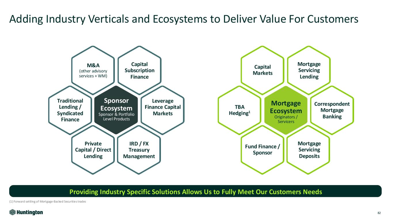 Our Vertical Strategy Established through Systematic Evaluation of Opportunities Multiple Layers of Growth with Logical Extensions of Capabilities Market Attractiveness (Loans, Deposits, Fees, Returns) Compelling (~$5B+ Loans / Deposits opportunity) • Highest growth segments with greatest capability alignment for quick scalability • Currently active and growing ‘resume’ across these verticals Low High H u n ti n gt o n R ig h t to W in (E xp er ti se , Ca pa bi lit ie s) Compelling Growth Niche Growth Competitive Growth High 81 Niche (~$1B+ Loans / Deposits opportunity) • Specialized market for those with unique, tailored capabilities • Opportunity to leverage asset finance teams and Capstone acquisition for cash management capabilities Competitive (~$3B+ Loans / Deposits opportunity) • Market/competitor disruptions/opportunities enable opportunistic entry into new, attractive verticals • High deposit levels make select segments attractive