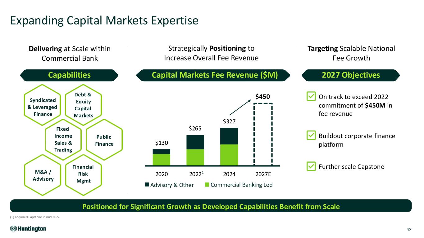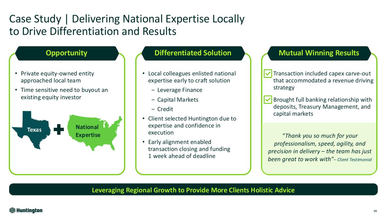 Case Study | Delivering National Expertise Locally to Drive Differentiation and Results 84 Leveraging Regional Growth to Provide More Clients Holistic Advice Mutual Winning Results Transaction included capex carve-out that accommodated a revenue driving strategy Brought full banking relationship with deposits, Treasury Management, and capital markets Differentiated Solution • Local colleagues enlisted national expertise early to craft solution ‒ Leverage Finance ‒ Capital Markets ‒ Credit • Client selected Huntington due to expertise and confidence in execution • Early alignment enabled transaction closing and funding 1 week ahead of deadline Opportunity • Private equity-owned entity approached local team • Time sensitive need to buyout an existing equity investor “Thank you so much for your professionalism, speed, agility, and precision in delivery – the team has just been great to work with"– Client Testimonial Texas National Expertise