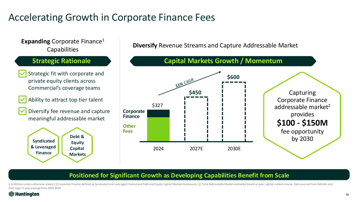 2020 2022 2024 2027E Expanding Capital Markets Expertise 85 (1) Acquired Capstone in mid 2022 Positioned for Significant Growth as Developed Capabilities Benefit from Scale On track to exceed 2022 commitment of $450M in fee revenue Buildout corporate finance platform Further scale Capstone Strategically Positioning to Increase Overall Fee Revenue Delivering at Scale within Commercial Bank Targeting Scalable National Fee Growth Financial Risk Mgmt Syndicated & Leveraged Finance Debt & Equity Capital Markets Fixed Income Sales & Trading M&A / Advisory Public Finance $130 $265 $327 $450 Advisory & Other Commercial Banking Led Capabilities Capital Markets Fee Revenue ($M) 2027 Objectives 1