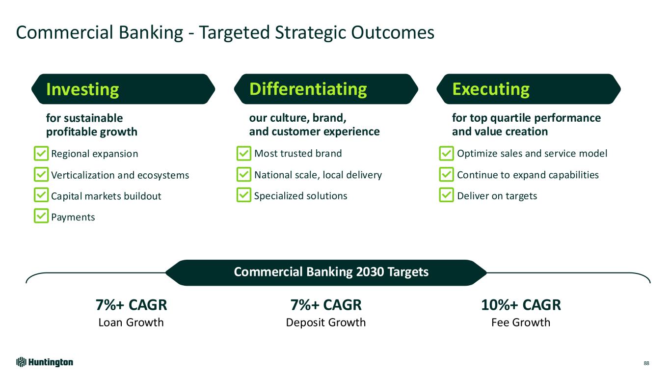 Commercial Banking - Targeted Strategic Outcomes Differentiating our culture, brand, and customer experience Most trusted brand National scale, local delivery Specialized solutions Executing for top quartile performance and value creation Optimize sales and service model Continue to expand capabilities Deliver on targets Investing for sustainable profitable growth Regional expansion Verticalization and ecosystems Capital markets buildout Payments Commercial Banking 2030 Targets 7%+ CAGR Loan Growth 7%+ CAGR Deposit Growth 10%+ CAGR Fee Growth 88
