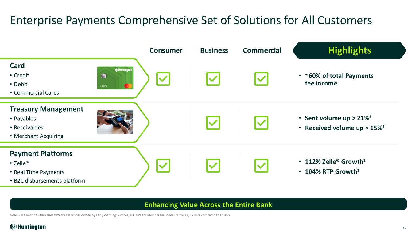 Treasury Management • Payables • Receivables • Merchant Acquiring Payment Platforms • Zelle® • Real Time Payments • B2C disbursements platform Consumer Business Commercial Enterprise Payments Comprehensive Set of Solutions for All Customers 91 Note: Zelle and the Zelle related marks are wholly owned by Early Warning Services, LLC and are used herein under license; (1) FY2024 compared to FY2022 Enhancing Value Across the Entire Bank • 112% Zelle® Growth1 • 104% RTP Growth1 • ~60% of total Payments fee income • Sent volume up > 21%1 • Received volume up > 15%1 Card • Credit • Debit • Commercial Cards Highlights