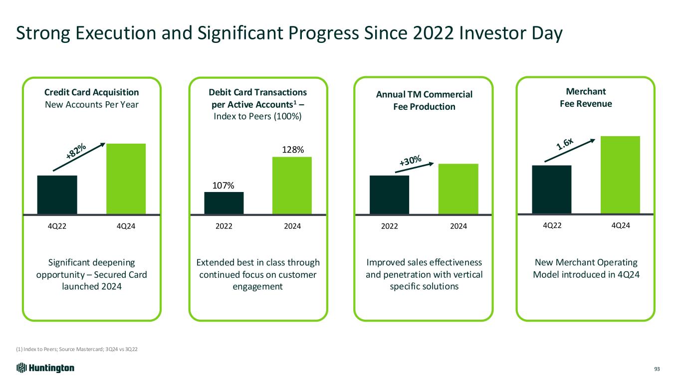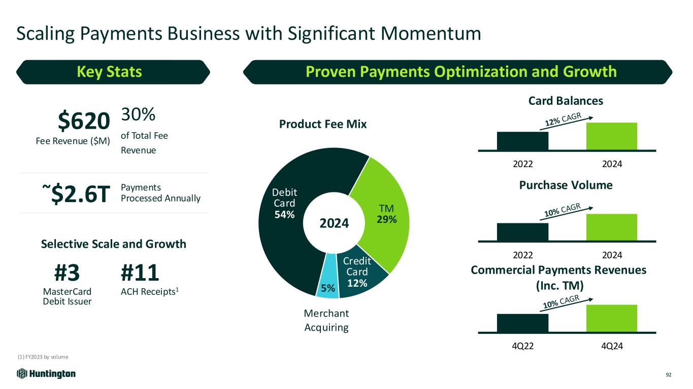 Debit Card 54% TM 29% Credit Card 12%5% Scaling Payments Business with Significant Momentum (1) FY2023 by volume $620 Fee Revenue ($M) 30% of Total Fee Revenue ~$2.6T Payments Processed Annually Selective Scale and Growth #3 MasterCard Debit Issuer #11 ACH Receipts1 Card Balances 2024 2022 2024 Proven Payments Optimization and GrowthKey Stats Merchant Acquiring Product Fee Mix 2022 2024 Purchase Volume Commercial Payments Revenues (Inc. TM) 4Q22 4Q24 92
