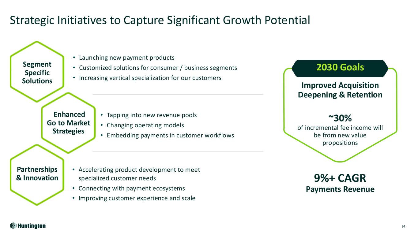 Strong Execution and Significant Progress Since 2022 Investor Day 93 (1) Index to Peers; Source Mastercard; 3Q24 vs 3Q22 107% 128% 2022 2024 Debit Card Transactions per Active Accounts1 – Index to Peers (100%) Extended best in class through continued focus on customer engagement 4Q22 4Q24 Merchant Fee Revenue New Merchant Operating Model introduced in 4Q24 2022 2024 Annual TM Commercial Fee Production Improved sales effectiveness and penetration with vertical specific solutions Credit Card Acquisition New Accounts Per Year Significant deepening opportunity – Secured Card launched 2024 4Q22 4Q24
