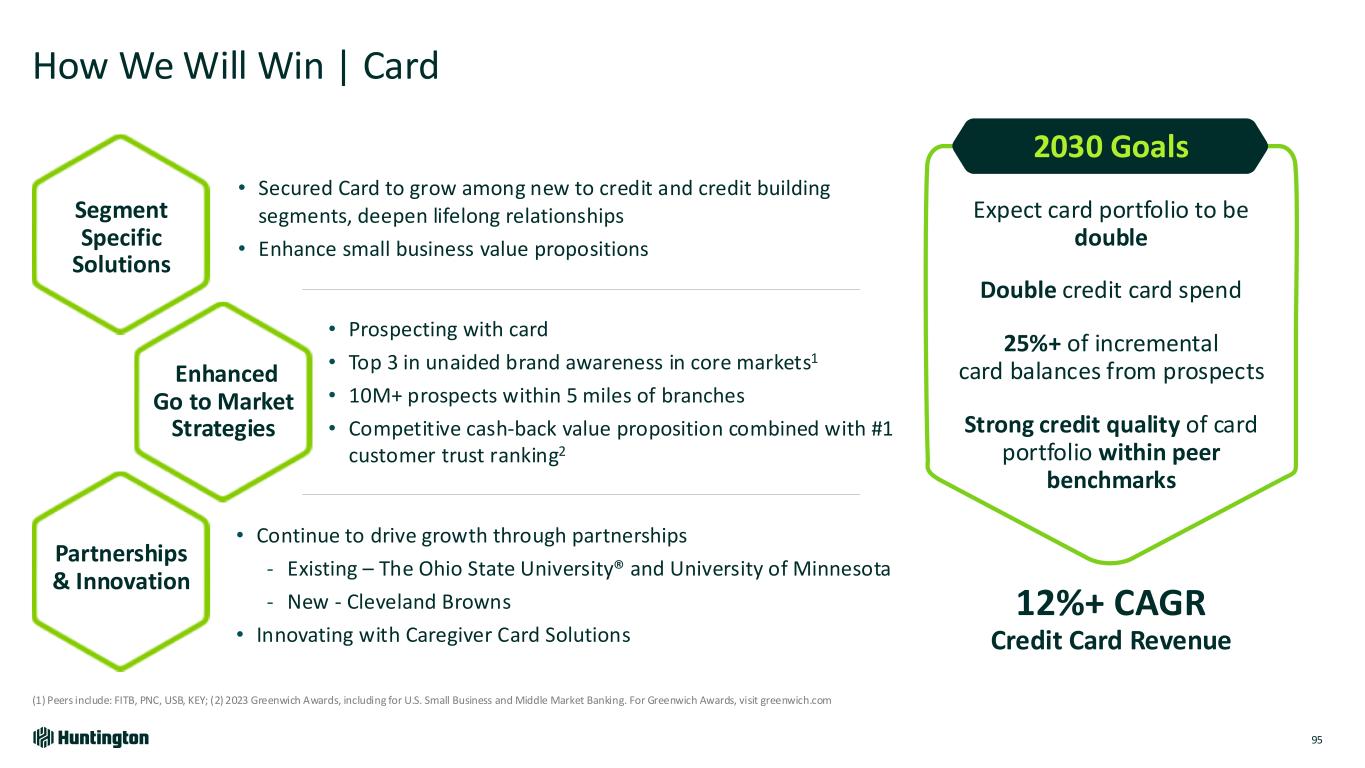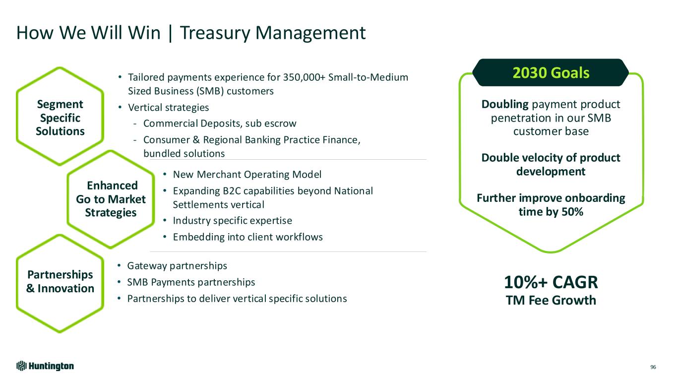 How We Will Win | Card 95 (1) Peers include: FITB, PNC, USB, KEY; (2) 2023 Greenwich Awards, including for U.S. Small Business and Middle Market Banking. For Greenwich Awards, visit greenwich.com Segment Specific Solutions Enhanced Go to Market Strategies Partnerships & Innovation • Secured Card to grow among new to credit and credit building segments, deepen lifelong relationships • Enhance small business value propositions • Continue to drive growth through partnerships - Existing – The Ohio State University® and University of Minnesota - New - Cleveland Browns • Innovating with Caregiver Card Solutions • Prospecting with card • Top 3 in unaided brand awareness in core markets1 • 10M+ prospects within 5 miles of branches • Competitive cash-back value proposition combined with #1 customer trust ranking2 Expect card portfolio to be double Double credit card spend 25%+ of incremental card balances from prospects Strong credit quality of card portfolio within peer benchmarks 12%+ CAGR Credit Card Revenue 2030 Goals