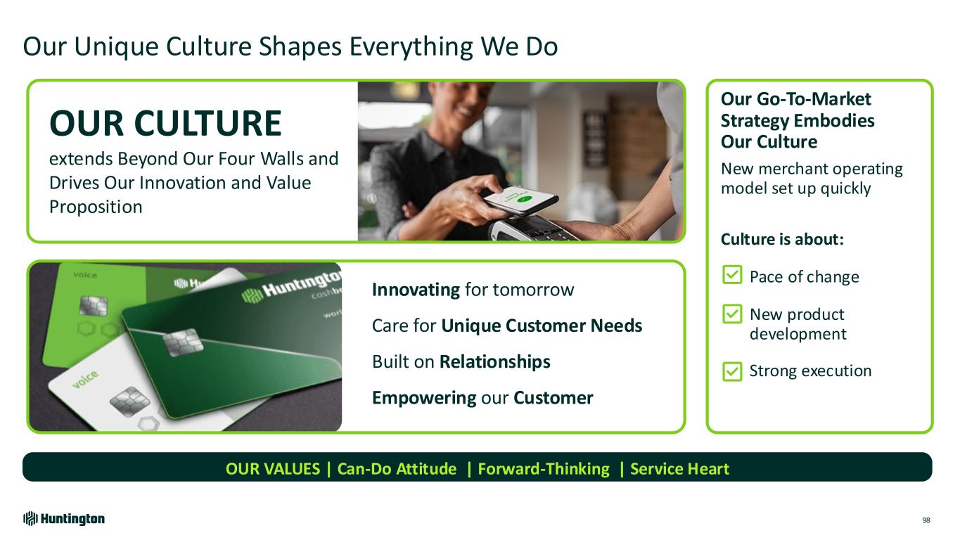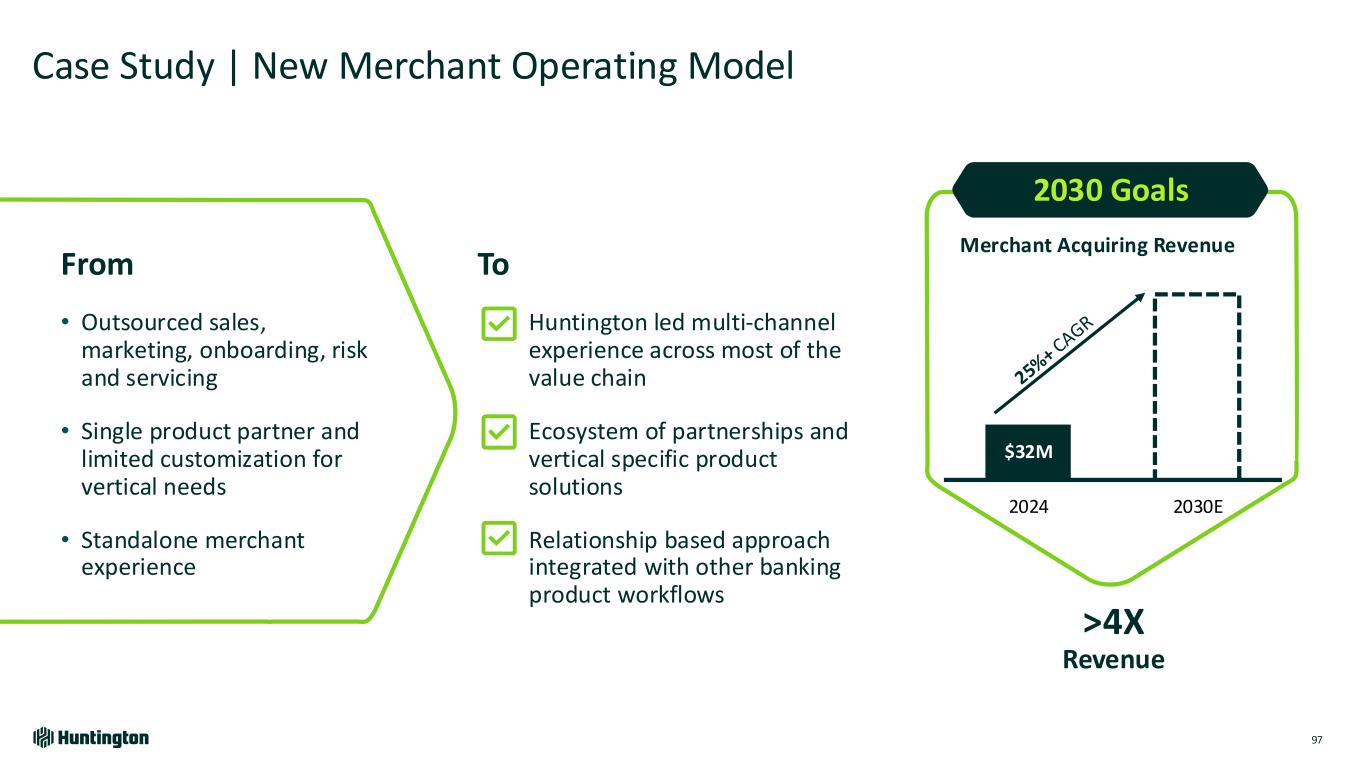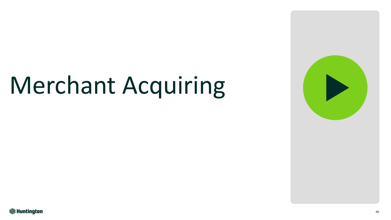 Case Study | New Merchant Operating Model 97 From • Outsourced sales, marketing, onboarding, risk and servicing • Single product partner and limited customization for vertical needs • Standalone merchant experience To Huntington led multi-channel experience across most of the value chain Ecosystem of partnerships and vertical specific product solutions Relationship based approach integrated with other banking product workflows 2024 2030E >4X Revenue $32M 2030 Goals Merchant Acquiring Revenue