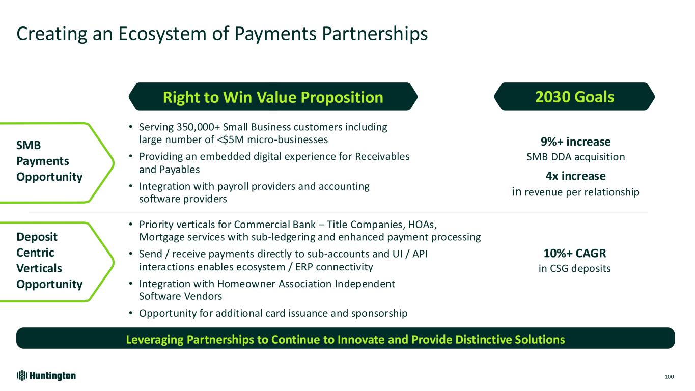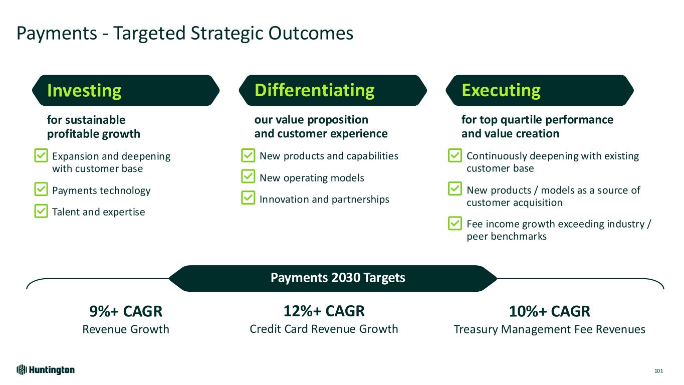 Creating an Ecosystem of Payments Partnerships 100 Leveraging Partnerships to Continue to Innovate and Provide Distinctive Solutions 9%+ increase SMB DDA acquisition 4x increase in revenue per relationship 10%+ CAGR in CSG deposits Right to Win Value Proposition SMB Payments Opportunity 2030 Goals • Serving 350,000+ Small Business customers including large number of <$5M micro-businesses • Providing an embedded digital experience for Receivables and Payables • Integration with payroll providers and accounting software providers • Priority verticals for Commercial Bank – Title Companies, HOAs, Mortgage services with sub-ledgering and enhanced payment processing • Send / receive payments directly to sub-accounts and UI / API interactions enables ecosystem / ERP connectivity • Integration with Homeowner Association Independent Software Vendors • Opportunity for additional card issuance and sponsorship Deposit Centric Verticals Opportunity