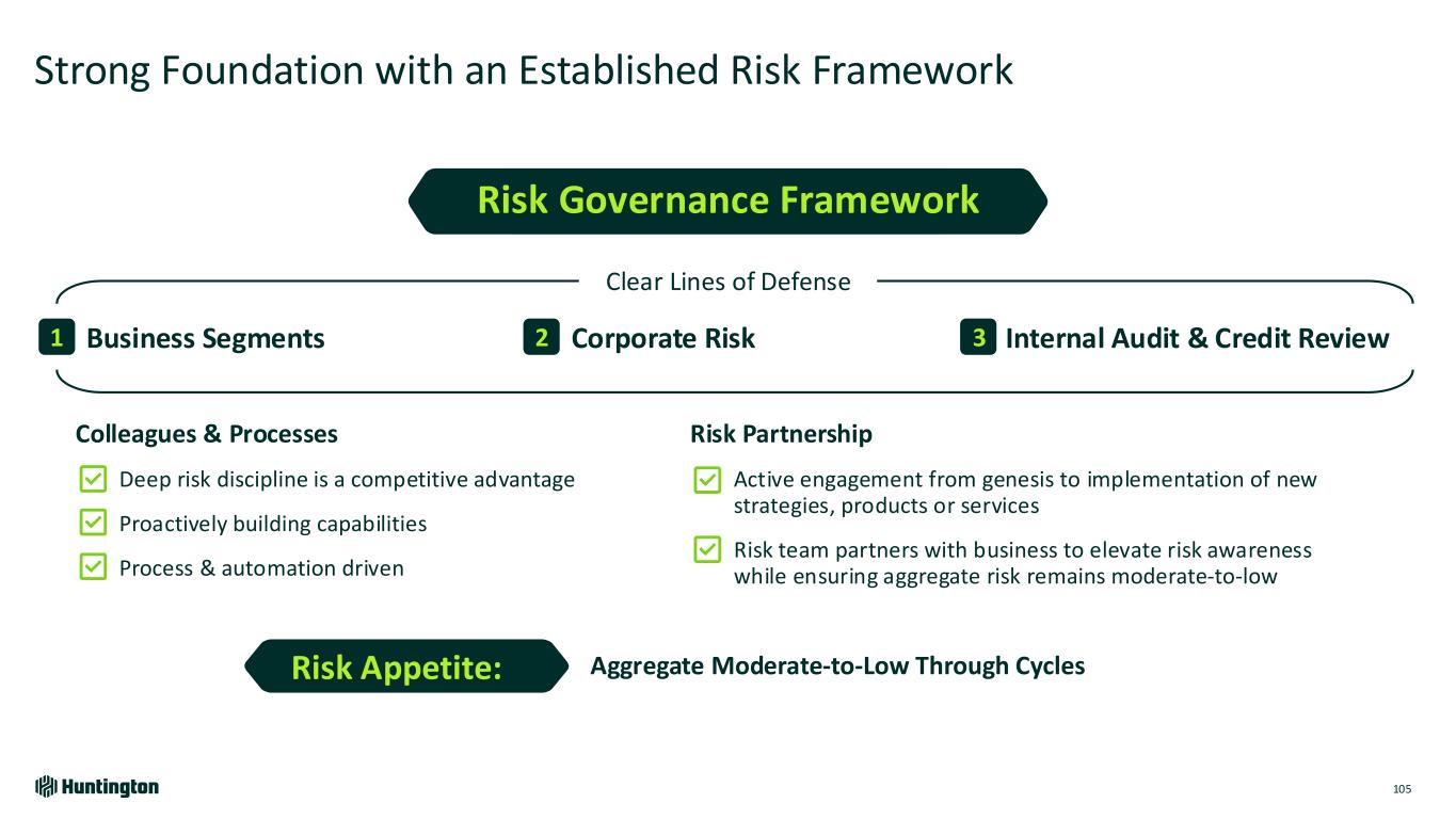 Risk Management Key Messages 104 Disciplined management of aggregate moderate-to-low risk appetite is a competitive advantage Outperformance supported by strong risk management culture that permeates the company Scalable risk processes and controls enable balanced risk and reward 1 2 3