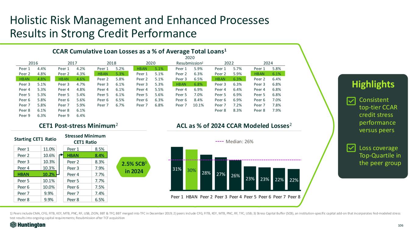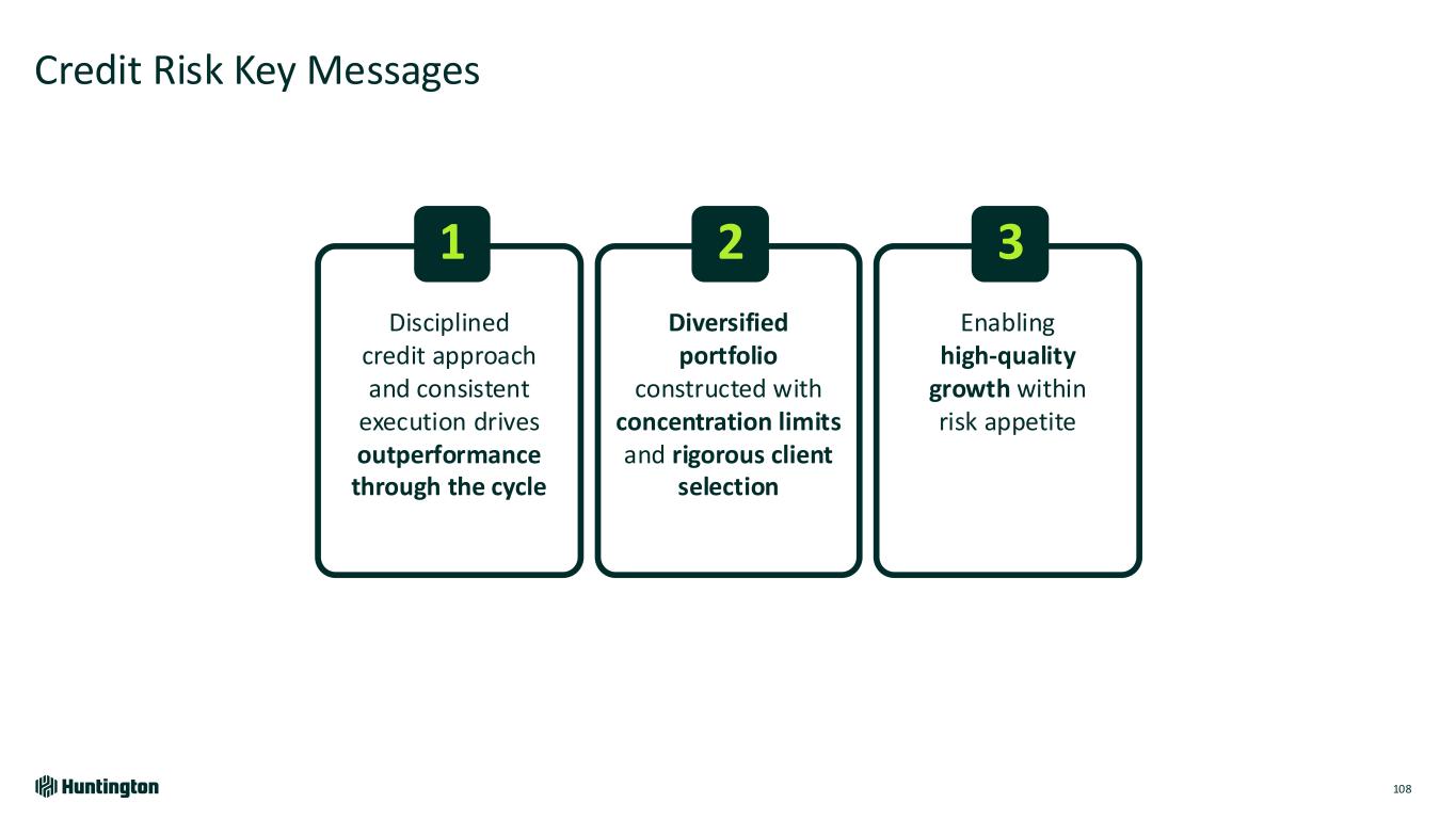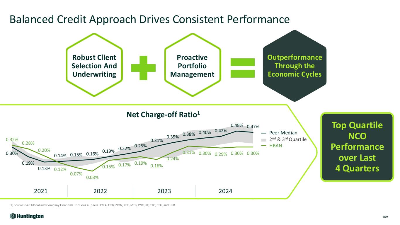 Holistic Risk Management and Enhanced Processes Results in Strong Credit Performance 106 1) Peers include CMA, CFG, FITB, KEY, MTB, PNC, RF, USB, ZION, BBT & TFC; BBT merged into TFC in December 2019; 2) peers include CFG, FITB, KEY, MTB, PNC, RF, TFC, USB; 3) Stress Capital Buffer (SCB), an institution-specific capital add-on that incorporates Fed-modeled stress test results into ongoing capital requirements; Resubmission after TCF acquisition CCAR Cumulative Loan Losses as a % of Average Total Loans1 2016 2017 2018 2020 2020 Resubmission2 2022 2024 Peer 1 4.4% Peer 1 4.2% Peer 1 5.2% HBAN 5.1% Peer 1 5.9% Peer 1 5.7% Peer 1 5.8% Peer 2 4.8% Peer 2 4.3% HBAN 5.3% Peer 1 5.1% Peer 2 6.3% Peer 2 5.9% HBAN 6.1% HBAN 4.8% HBAN 4.6% Peer 2 5.8% Peer 2 5.1% Peer 3 6.5% HBAN 6.3% Peer 2 6.4% Peer 3 5.1% Peer 3 4.7% Peer 3 6.1% Peer 3 5.3% HBAN 6.8% Peer 3 6.3% Peer 3 6.8% Peer 4 5.3% Peer 4 4.8% Peer 4 6.1% Peer 4 5.5% Peer 4 6.9% Peer 4 6.4% Peer 4 6.8% Peer 5 5.3% Peer 5 5.4% Peer 5 6.1% Peer 5 5.6% Peer 5 7.0% Peer 5 6.9% Peer 5 6.8% Peer 6 5.8% Peer 6 5.6% Peer 6 6.5% Peer 6 6.3% Peer 6 8.4% Peer 6 6.9% Peer 6 7.0% Peer 7 5.8% Peer 7 5.9% Peer 7 6.7% Peer 7 6.8% Peer 7 10.1% Peer 7 7.2% Peer 7 7.8% Peer 8 6.1% Peer 8 6.1% Peer 8 8.3% Peer 8 7.9% Peer 9 6.3% Peer 9 6.4% 31% 30% 28% 27% 26% 23% 23% 22% 22% Peer 1 HBAN Peer 2 Peer 3 Peer 4 Peer 5 Peer 6 Peer 7 Peer 8 Median: 26% Peer 1 11.0% Peer 2 10.6% Peer 3 10.3% Peer 4 10.3% HBAN 10.2% Peer 5 10.1% Peer 6 10.0% Peer 7 9.9% Peer 8 9.9% Starting CET1 Ratio Stressed Minimum CET1 Ratio ACL as % of 2024 CCAR Modeled Losses2 Highlights CET1 Post-stress Minimum2 Peer 1 8.5% HBAN 8.4% Peer 2 8.3% Peer 3 7.9% Peer 4 7.7% Peer 5 7.7% Peer 6 7.5% Peer 7 7.4% Peer 8 6.5% 2.5% SCB3 in 2024 Consistent top-tier CCAR credit stress performance versus peers Loss coverage Top-Quartile in the peer group