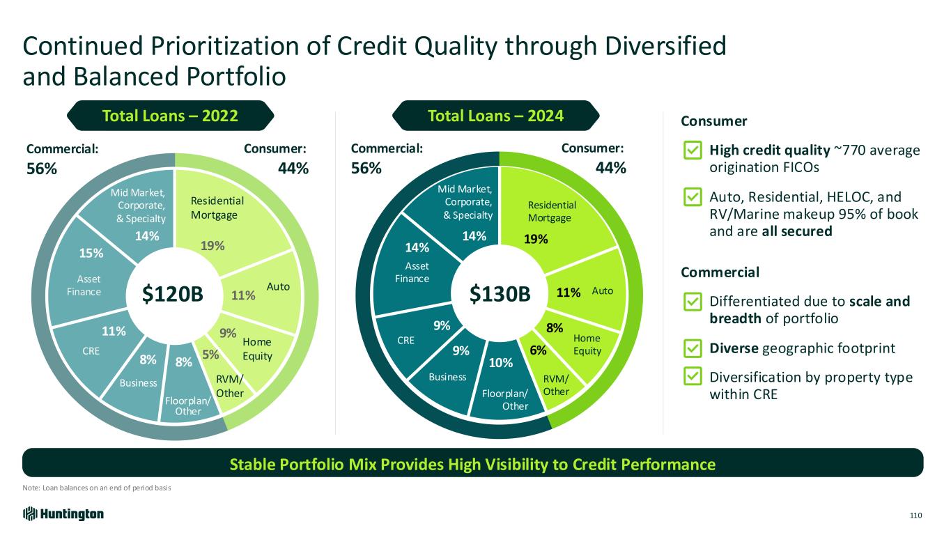 Top Quartile NCO Performance over Last 4 Quarters Balanced Credit Approach Drives Consistent Performance 109 0.30% 0.19% 0.13% 0.14% 0.15% 0.16% 0.19% 0.22% 0.25% 0.31% 0.35% 0.38% 0.40% 0.42% 0.48% 0.47% 0.32% 0.28% 0.20% 0.12% 0.07% 0.03% 0.15% 0.17% 0.19% 0.16% 0.24% 0.31% 0.30% 0.29% 0.30% 0.30% (1) Source: S&P Global and Company Financials. Includes all peers: CMA, FITB, ZION, KEY, MTB, PNC, RF, TFC, CFG, and USB Robust Client Selection And Underwriting Proactive Portfolio Management Outperformance Through the Economic Cycles 2021 2022 2023 2024 Net Charge-off Ratio1 HBAN Peer Median 2nd & 3rd Quartile