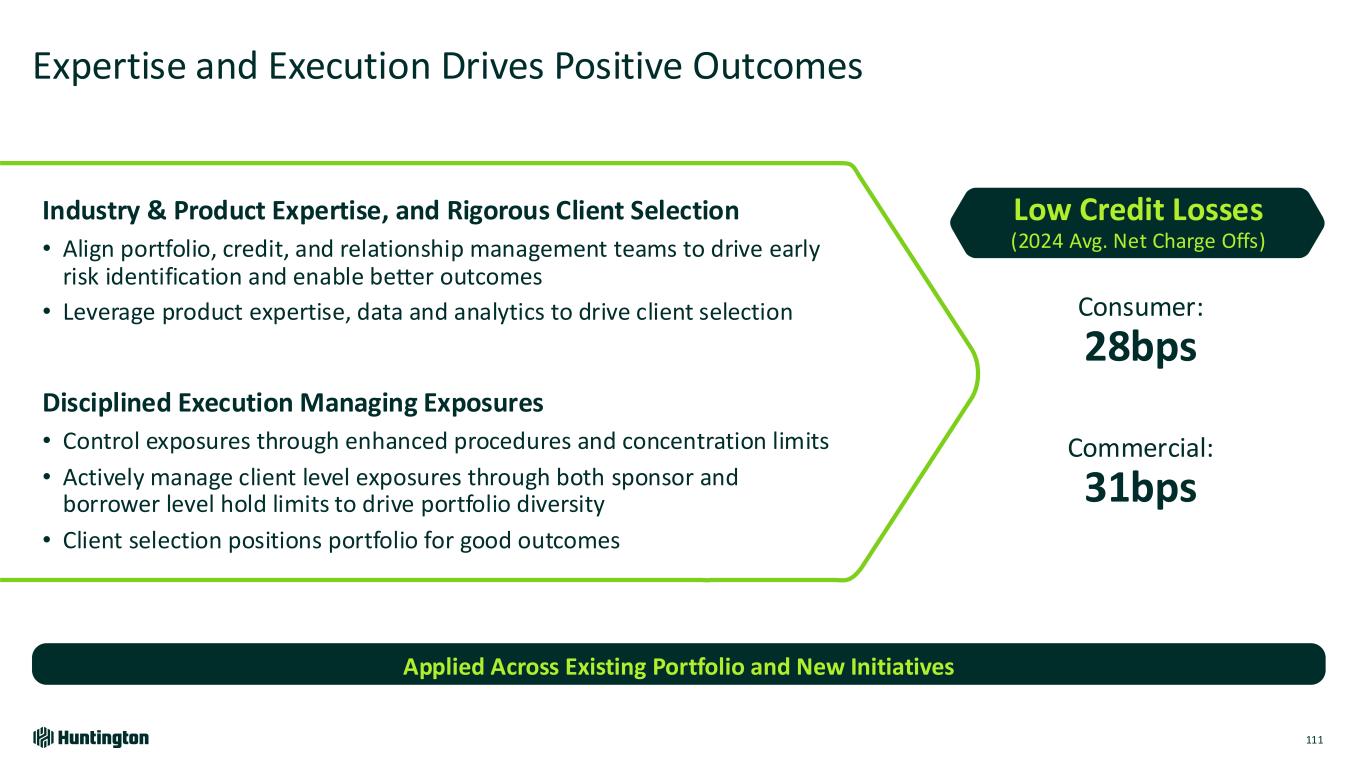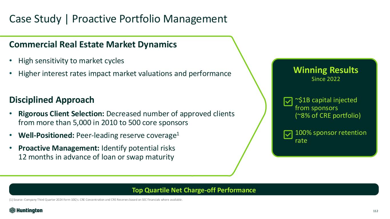 Expertise and Execution Drives Positive Outcomes 111 Applied Across Existing Portfolio and New Initiatives Industry & Product Expertise, and Rigorous Client Selection • Align portfolio, credit, and relationship management teams to drive early risk identification and enable better outcomes • Leverage product expertise, data and analytics to drive client selection Disciplined Execution Managing Exposures • Control exposures through enhanced procedures and concentration limits • Actively manage client level exposures through both sponsor and borrower level hold limits to drive portfolio diversity • Client selection positions portfolio for good outcomes Consumer: 28bps Commercial: 31bps Low Credit Losses (2024 Avg. Net Charge Offs)