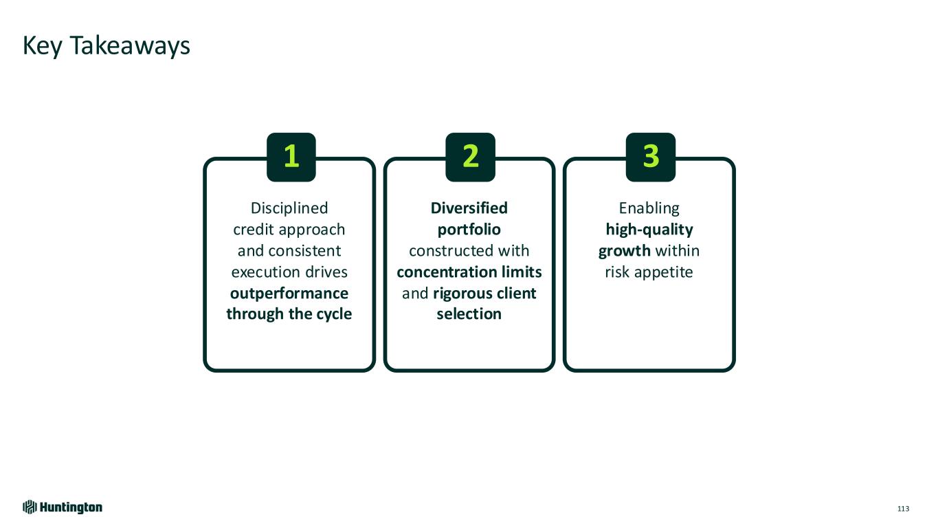 Case Study | Proactive Portfolio Management 112 (1) Source: Company Third Quarter 2024 Form 10Q's. CRE Concentration and CRE Reserves based on SEC financials where available. Top Quartile Net Charge-off Performance Commercial Real Estate Market Dynamics • High sensitivity to market cycles • Higher interest rates impact market valuations and performance Disciplined Approach • Rigorous Client Selection: Decreased number of approved clients from more than 5,000 in 2010 to 500 core sponsors • Well-Positioned: Peer-leading reserve coverage1 • Proactive Management: Identify potential risks 12 months in advance of loan or swap maturity ~$1B capital injected from sponsors (~8% of CRE portfolio) 100% sponsor retention rate Winning Results Since 2022