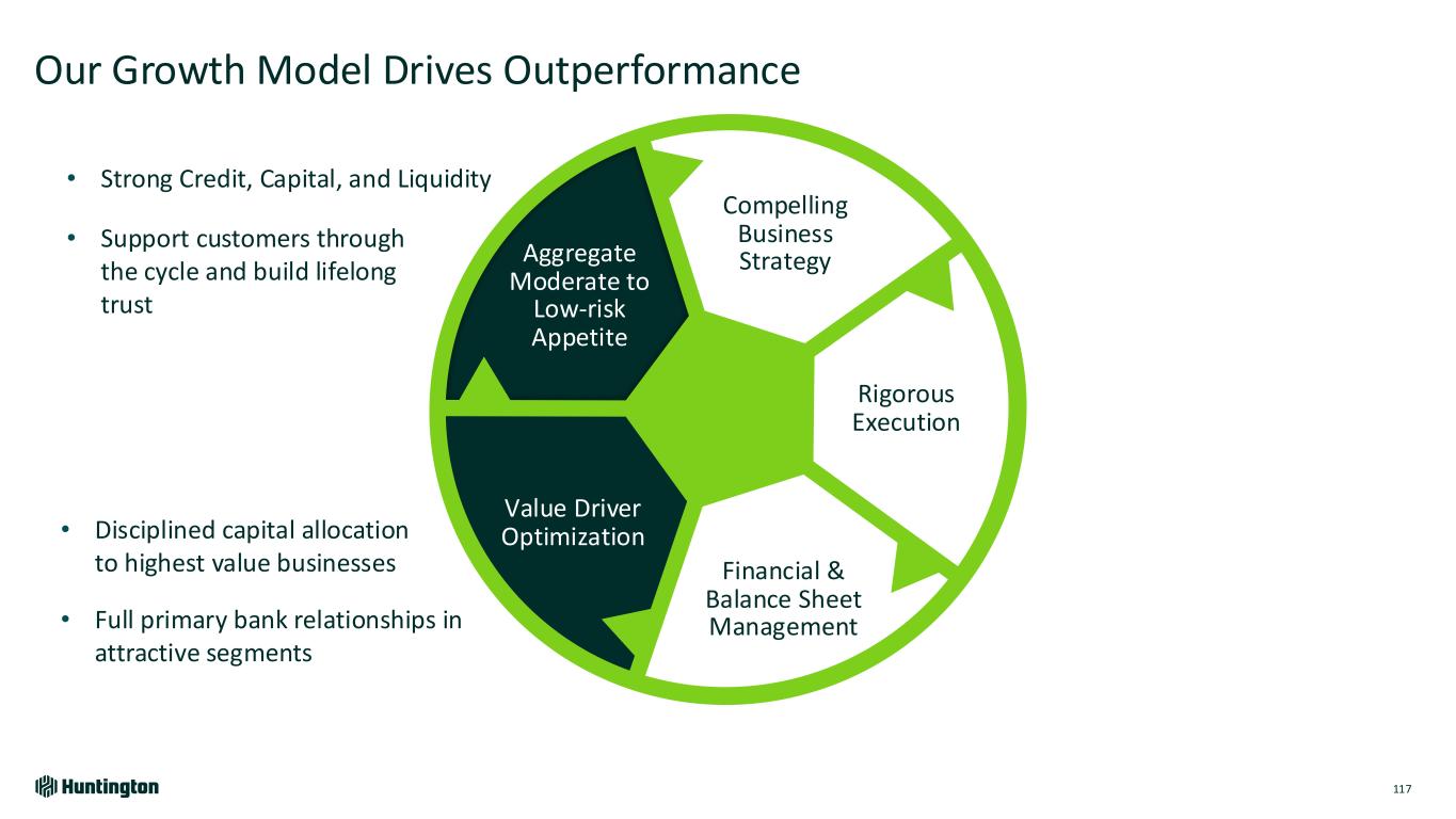 Our Growth Model Drives Outperformance 116 Rigorous Execution Compelling Business Strategy Financial & Balance Sheet Management Value Driver Optimization Aggregate Moderate to Low-risk Appetite • Customer-centered, best- in-class service • Operators implementing clear action plans • Proactive, dynamic adjustment to market conditions • Fueling growth investments with consistent expense re-engineering • Targeting growth segments with differentiated expertise • Hedging to create low volatility and consistent earnings power