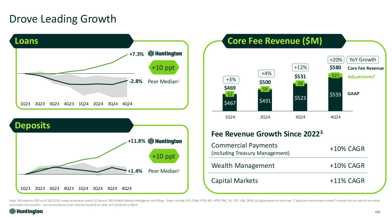 Huntington Thrived During This Time (1) Bank data as of 3Q24. Source: Company’s 2024 Form 10-Q or Bank Call Report depending on data availability | Publicly traded US-based banks with >$100 billion in deposits and all peers (excludes banks primarily classified as card banks; (2) Cash equals cash and cash equivalents. Coverage includes Contingent Capacity at Federal Reserve & FHLB + Cash & Equivalents. Based on estimated 12/31/24 uninsured deposits; Source: S&P Global – Includes all peers: CMA, FITB, ZION, KEY, MTB, PNC, RF, TFC, CFG, and USB Accelerated Strategic Growth Initiatives and PPNR Outlook Capital ✓ Hedge program ✓ Top-tier ROTCE ✓ Managing on adj. CET1 Strong capital levels Robust capital generation Operated from a Position of Strength Liquidity ✓ Leading Deposit Growth ✓ Robust cash and contingent liquidity #1 Insured Deposits of Banks above $100B #1 Coverage Ratio of 197%1 Credit ✓ High-quality diversified loan portfolio Top-quartile ACL Coverage Top-quartile Net Charge-offs 119 Invested in Growth as Industry Pulled Back • Compounded growth in primary banking relationships • Launched into North & South Carolina and Texas • Established 8 new commercial verticals • Expanded payments, wealth management and capital markets Investments Contributing to Increased Profitability