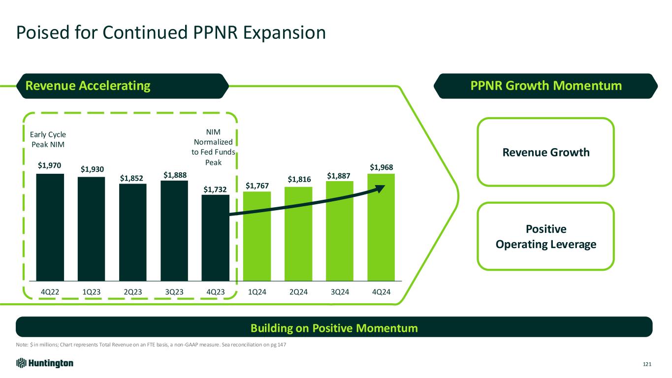 $1,970 $1,930 $1,852 $1,888 $1,732 $1,767 $1,816 $1,887 $1,968 4Q22 1Q23 2Q23 3Q23 4Q23 1Q24 2Q24 3Q24 4Q24 Poised for Continued PPNR Expansion 121 Note: $ in millions; Chart represents Total Revenue on an FTE basis, a non-GAAP measure. Sea reconciliation on pg 147 Building on Positive Momentum Revenue Growth Positive Operating Leverage NIM Normalized to Fed Funds Peak Early Cycle Peak NIM Revenue Accelerating PPNR Growth Momentum