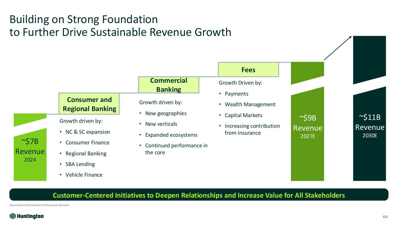 Building on Strong Foundation to Further Drive Sustainable Revenue Growth Illustrative Contribution of Revenue Growth Customer-Centered Initiatives to Deepen Relationships and Increase Value for All Stakeholders Consumer and Regional Banking Growth driven by: • NC & SC expansion • Consumer Finance • Regional Banking • SBA Lending • Vehicle Finance Growth driven by: • New geographies • New verticals • Expanded ecosystems • Continued performance in the core Fees Growth Driven by: • Payments • Wealth Management • Capital Markets • Increasing contribution from Insurance ~$7B Revenue 2024 ~$9B Revenue 2027E ~$11B Revenue 2030E Commercial Banking 122