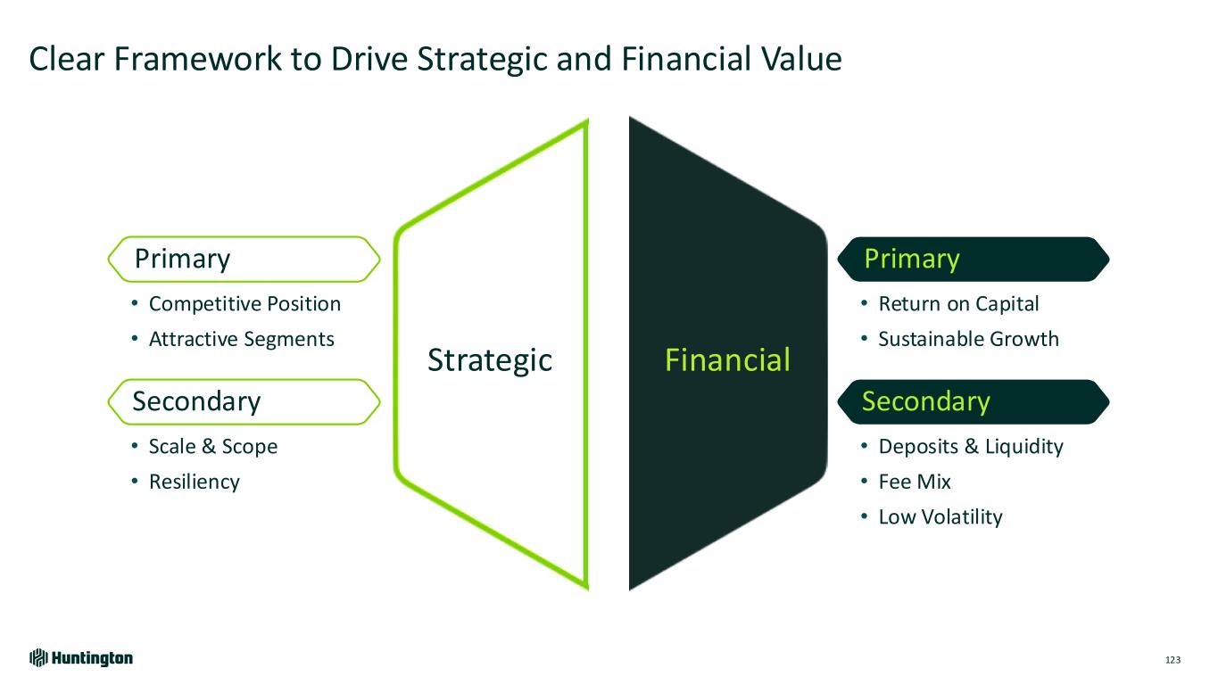 Clear Framework to Drive Strategic and Financial Value 123 Strategic • Competitive Position • Attractive Segments Primary Secondary • Scale & Scope • Resiliency • Return on Capital • Sustainable Growth Primary Secondary • Deposits & Liquidity • Fee Mix • Low Volatility Financial