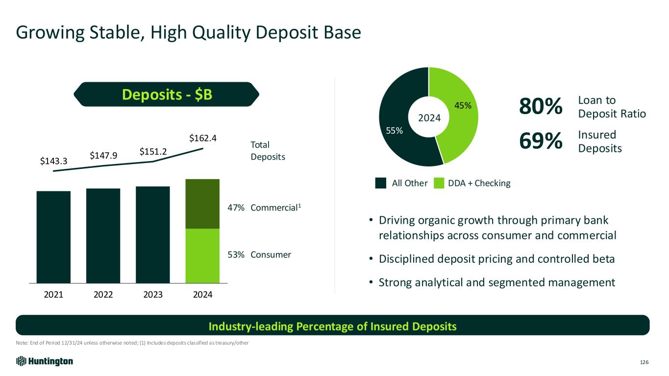 Growing Stable, High Quality Deposit Base All Other 126 Note: End of Period 12/31/24 unless otherwise noted; (1) Includes deposits classified as treasury/other Industry-leading Percentage of Insured Deposits $143.3 $147.9 $151.2 $162.4 2021 2022 2023 2024 • Driving organic growth through primary bank relationships across consumer and commercial • Disciplined deposit pricing and controlled beta • Strong analytical and segmented management 45% 55% 2024 69% 80% 53% 47% Commercial1 Consumer Total Deposits Deposits - $B Insured Deposits Loan to Deposit Ratio DDA + Checking