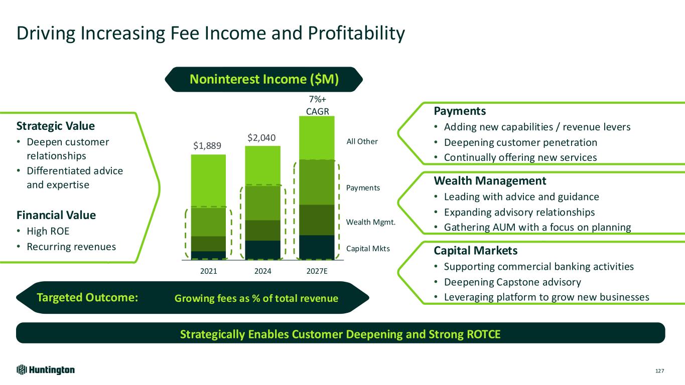 Targeted Outcome: Driving Increasing Fee Income and Profitability Strategically Enables Customer Deepening and Strong ROTCE Payments • Adding new capabilities / revenue levers • Deepening customer penetration • Continually offering new services Strategic Value • Deepen customer relationships • Differentiated advice and expertise Financial Value • High ROE • Recurring revenues Growing fees as % of total revenue 2021 2024 2027E 7%+ CAGR $1,889 $2,040 Payments Wealth Mgmt. Capital Mkts All Other Noninterest Income ($M) 127 Wealth Management • Leading with advice and guidance • Expanding advisory relationships • Gathering AUM with a focus on planning Capital Markets • Supporting commercial banking activities • Deepening Capstone advisory • Leveraging platform to grow new businesses