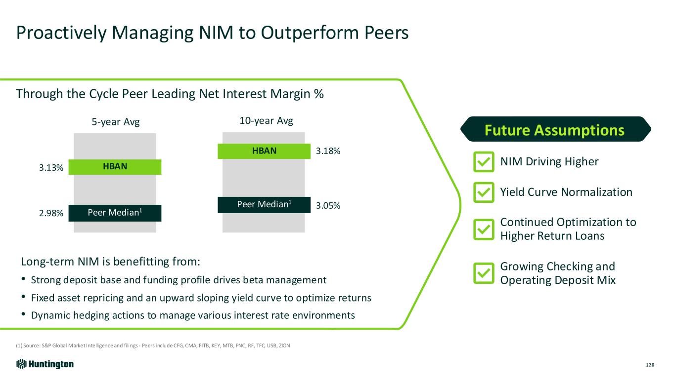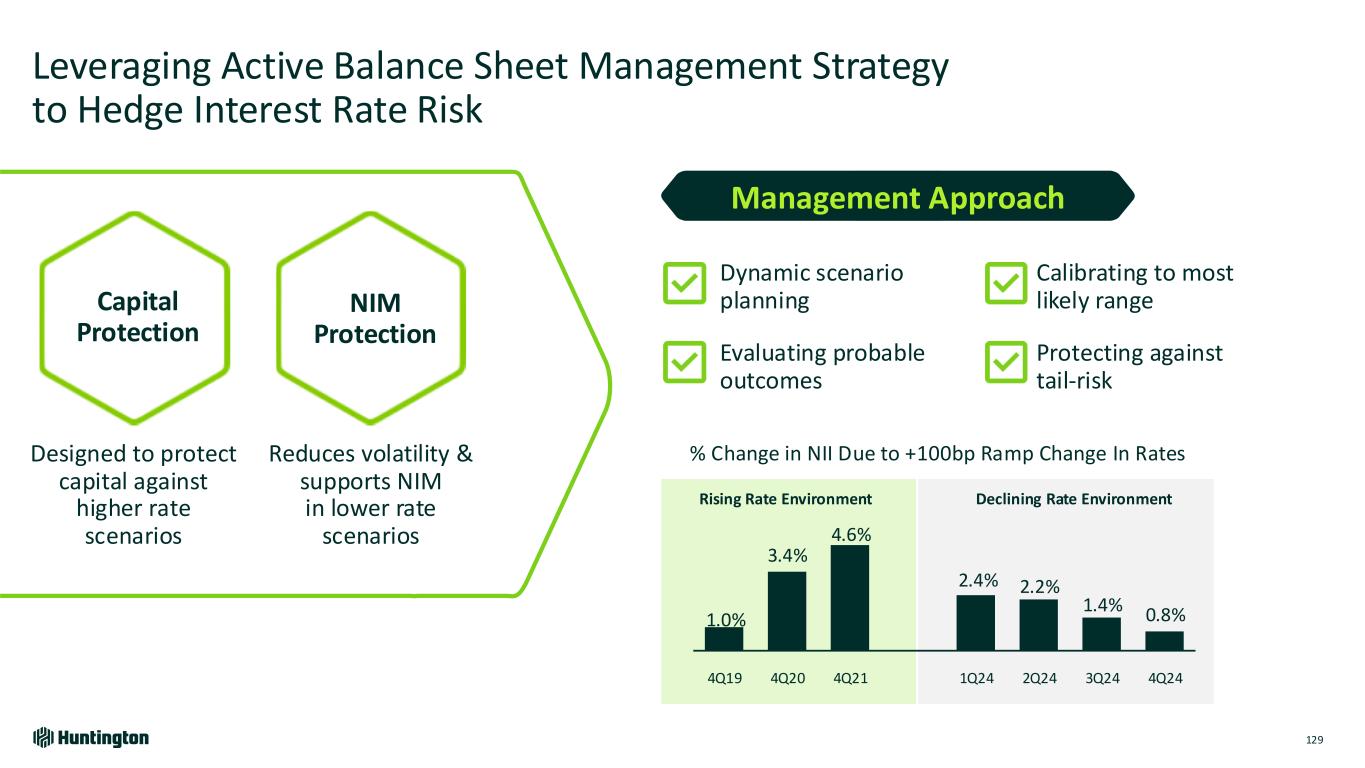 Future Assumptions Proactively Managing NIM to Outperform Peers 128 (1) Source: S&P Global Market Intelligence and filings ‐ Peers include CFG, CMA, FITB, KEY, MTB, PNC, RF, TFC, USB, ZION Through the Cycle Peer Leading Net Interest Margin % 3.18%HBAN HBAN Peer Median1 Peer Median1 5-year Avg 10-year Avg 2.98% 3.13% 3.05% Long-term NIM is benefitting from: • Strong deposit base and funding profile drives beta management • Fixed asset repricing and an upward sloping yield curve to optimize returns • Dynamic hedging actions to manage various interest rate environments NIM Driving Higher Yield Curve Normalization Continued Optimization to Higher Return Loans Growing Checking and Operating Deposit Mix