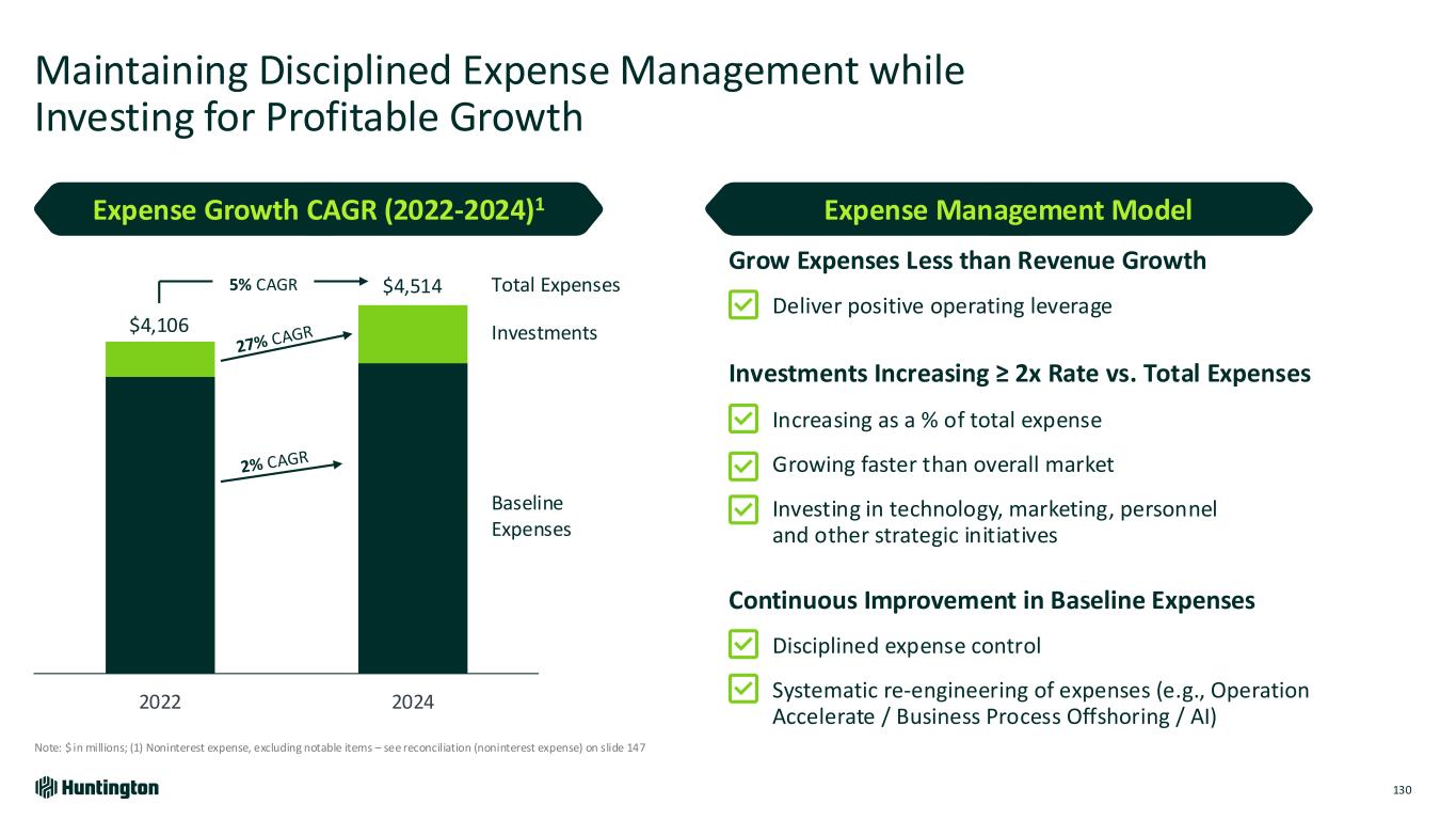Expense Management Model Maintaining Disciplined Expense Management while Investing for Profitable Growth 130 Note: $ in millions; (1) Noninterest expense, excluding notable items – see reconciliation (noninterest expense) on slide 147 2022 2024 Baseline Expenses Investments Total Expenses $4,106 $4,5145% CAGR Grow Expenses Less than Revenue Growth ✓Deliver positive operating leverage Investments Increasing ≥ 2x Rate vs. Total Expenses ✓ Increasing as a % of total expense ✓Growing faster than overall market ✓ Investing in technology, marketing, personnel and other strategic initiatives Continuous Improvement in Baseline Expenses ✓Disciplined expense control ✓Systematic re-engineering of expenses (e.g., Operation Accelerate / Business Process Offshoring / AI) Expense Growth CAGR (2022-2024)1