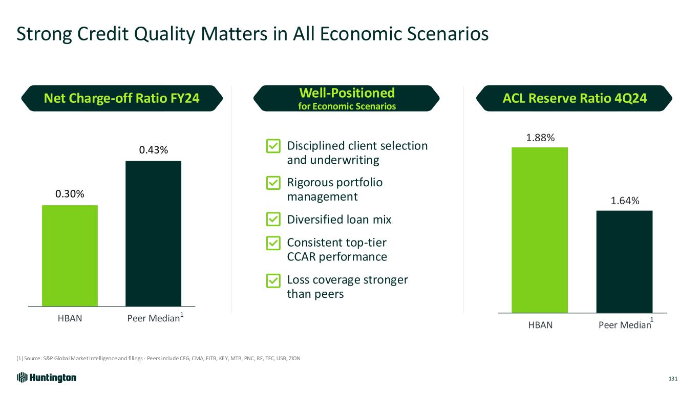Strong Credit Quality Matters in All Economic Scenarios 131 (1) Source: S&P Global Market Intelligence and filings ‐ Peers include CFG, CMA, FITB, KEY, MTB, PNC, RF, TFC, USB, ZION 0.30% 0.43% HBAN Peer Median 1.88% 1.64% HBAN Peer Median Net Charge-off Ratio FY24 Well-Positioned for Economic Scenarios ACL Reserve Ratio 4Q24 Disciplined client selection and underwriting Rigorous portfolio management Diversified loan mix Consistent top-tier CCAR performance Loss coverage stronger than peers 1 1