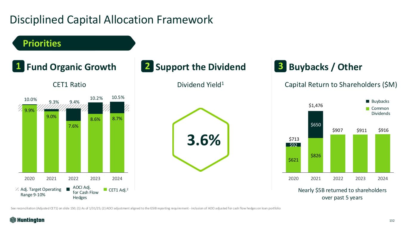 CET1 Ratio Disciplined Capital Allocation Framework See reconciliation (Adjusted CET1) on slide 150; (1) As of 1/31/25; (2) AOCI adjustment aligned to the GSIB reporting requirement - inclusion of AOCI adjusted for cash flow hedges on loan portfolio Dividend Yield1 Fund Organic Growth $621 $826 $92 $650 $713 $1,476 $911 $916 2020 2021 2022 2023 2024 Nearly $5B returned to shareholders over past 5 years Capital Return to Shareholders ($M) Common Dividends Buybacks Adj. Target Operating Range 9-10% AOCI Adj. for Cash Flow Hedges CET1 Adj.2 3.6% Priorities 1 Support the Dividend2 Buybacks / Other3 132 $907 9.9% 9.0% 7.6% 8.6% 8.7% 2020 2021 2022 2023 2024 10.2% 10.5% 9.4%9.3% 10.0%